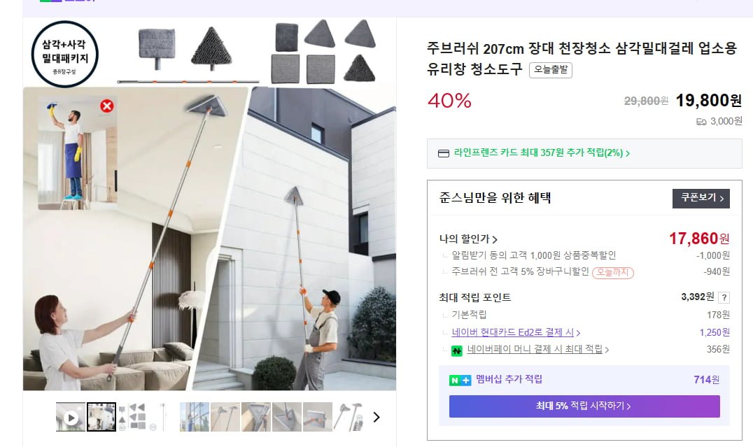 [네이버]207cm 장대 천장청소 삼각밀대걸레 업소용 유리창 청소도구 [17,860원/3,000원]