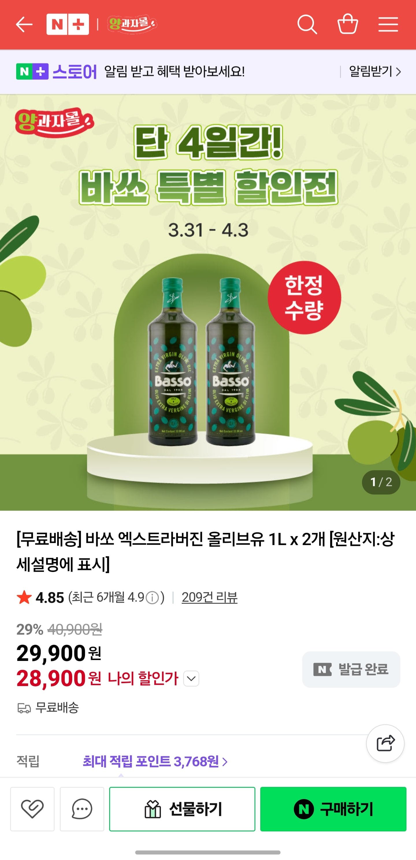 [네이버]바쏘 엑스트라버진 올리브유 1L x 2개 (29,900원/무료)