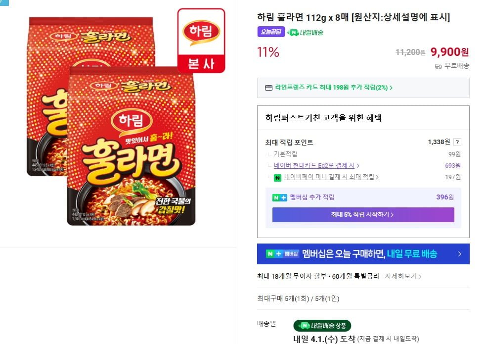 [네이버]하림 훌라면 112g x 8매 (9,900원/무료)