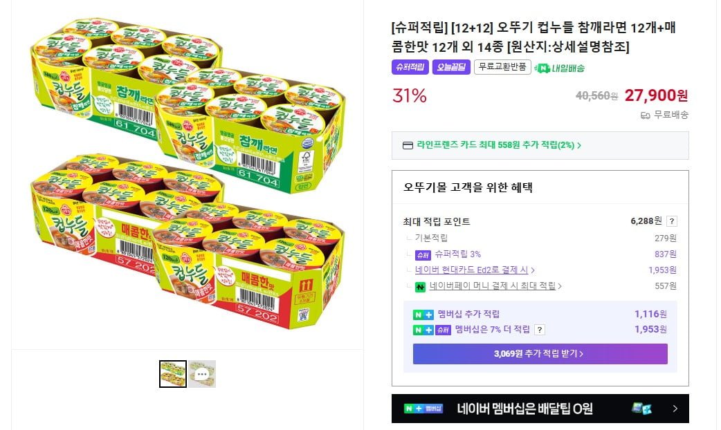 [네이버]오뚜기 컵누들 참깨라면 12개+매콤한맛 12개 외 14종 (27,900원/무료)