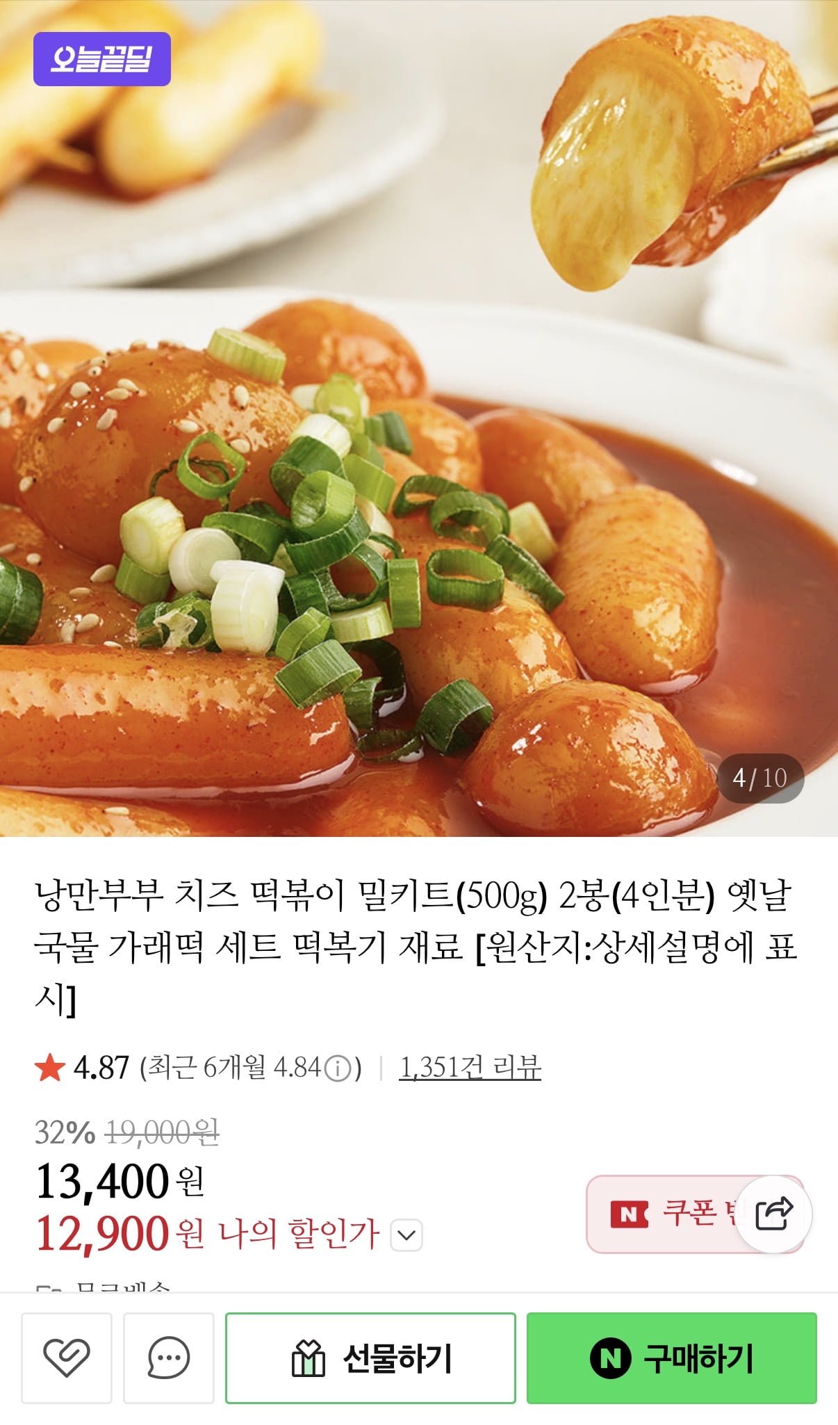 [네이버]치즈 떡볶이 밀키트 500g 2봉 4인분 (12,900원/무료)