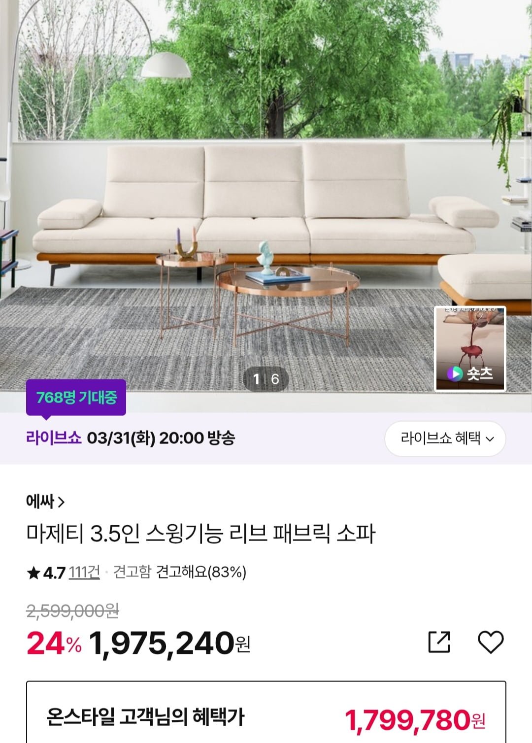 [CJ온스타일]에싸 마제티 패브릭 스윙기능 소파 (1,799,780원/무료) - 딜모아