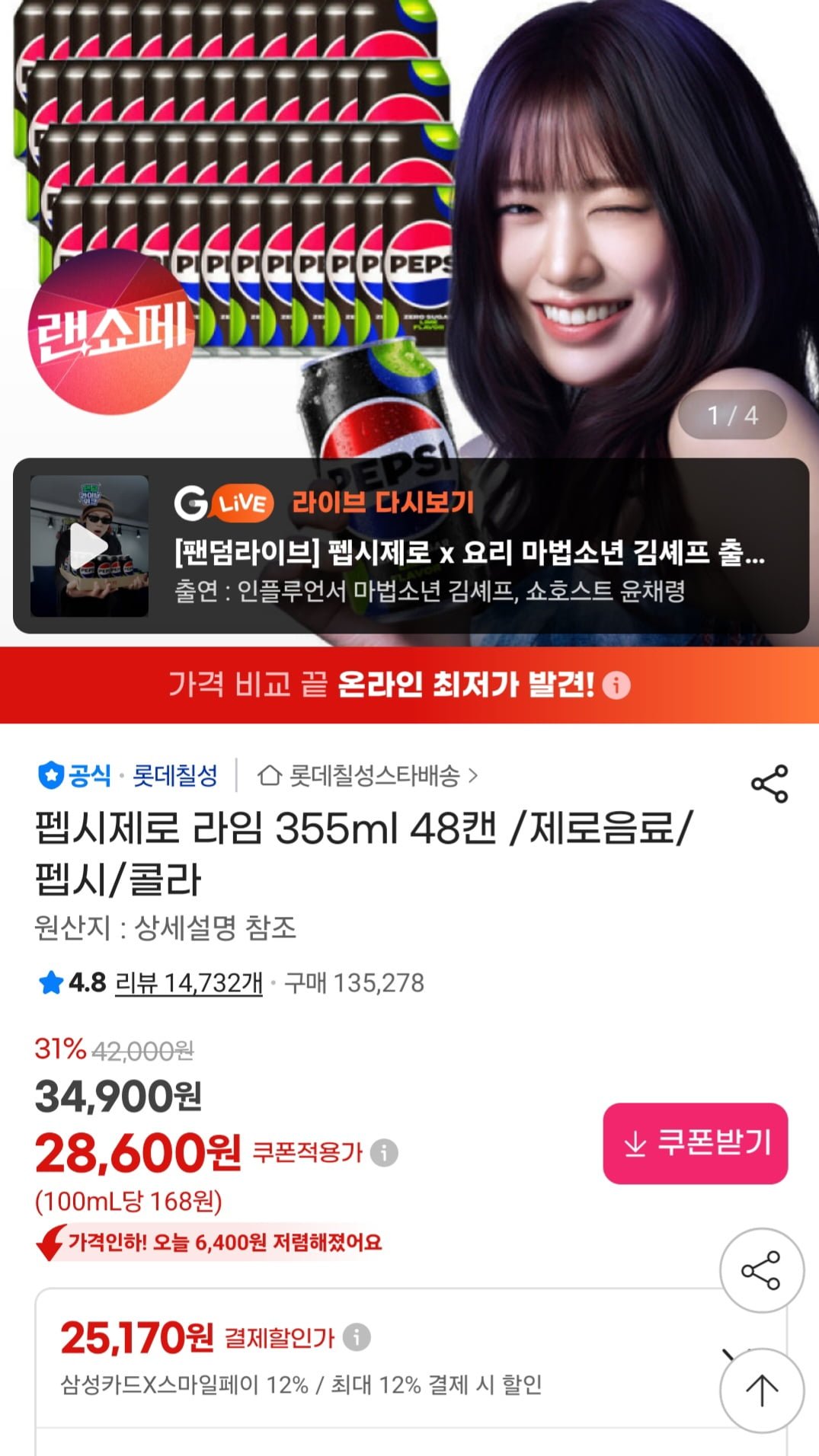 [지마켓]펩시제로 라임 355ml 48캔 (삼성카드 25,170원/무료) - 딜모아