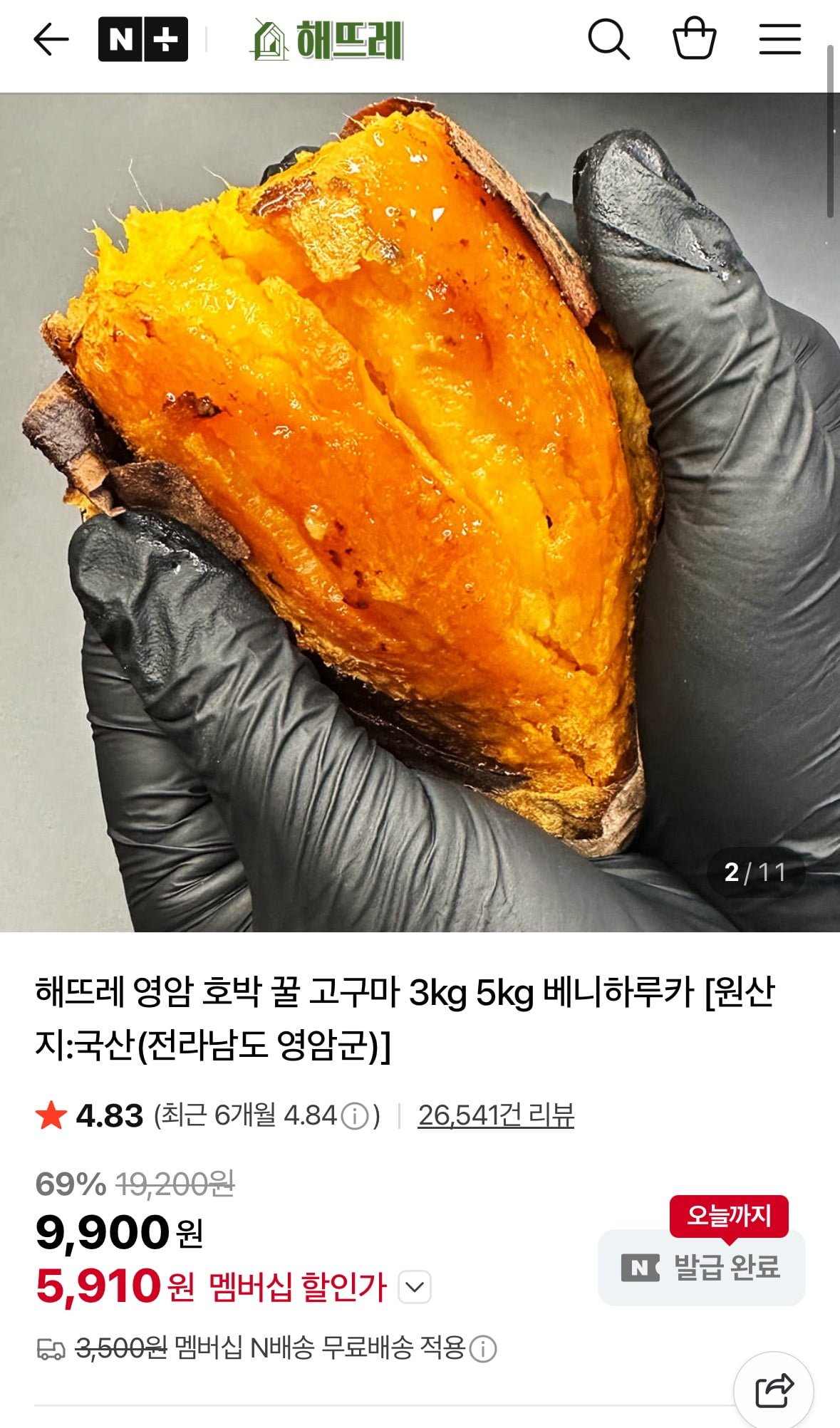 [네이버]해뜨레 영암 꿀 고구마 3kg(5,910원/네멤무배)