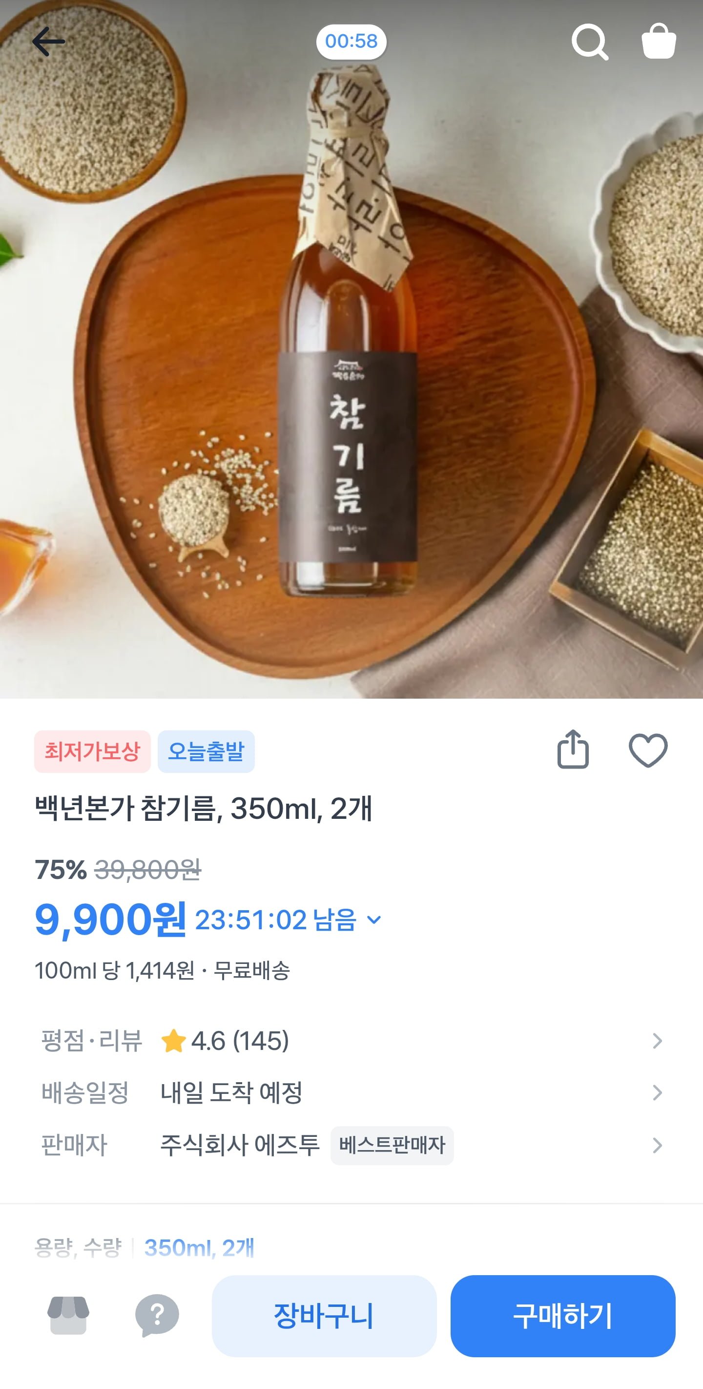 [토스]백년본가 참기름 350ml 2개 (9,900원/무료)