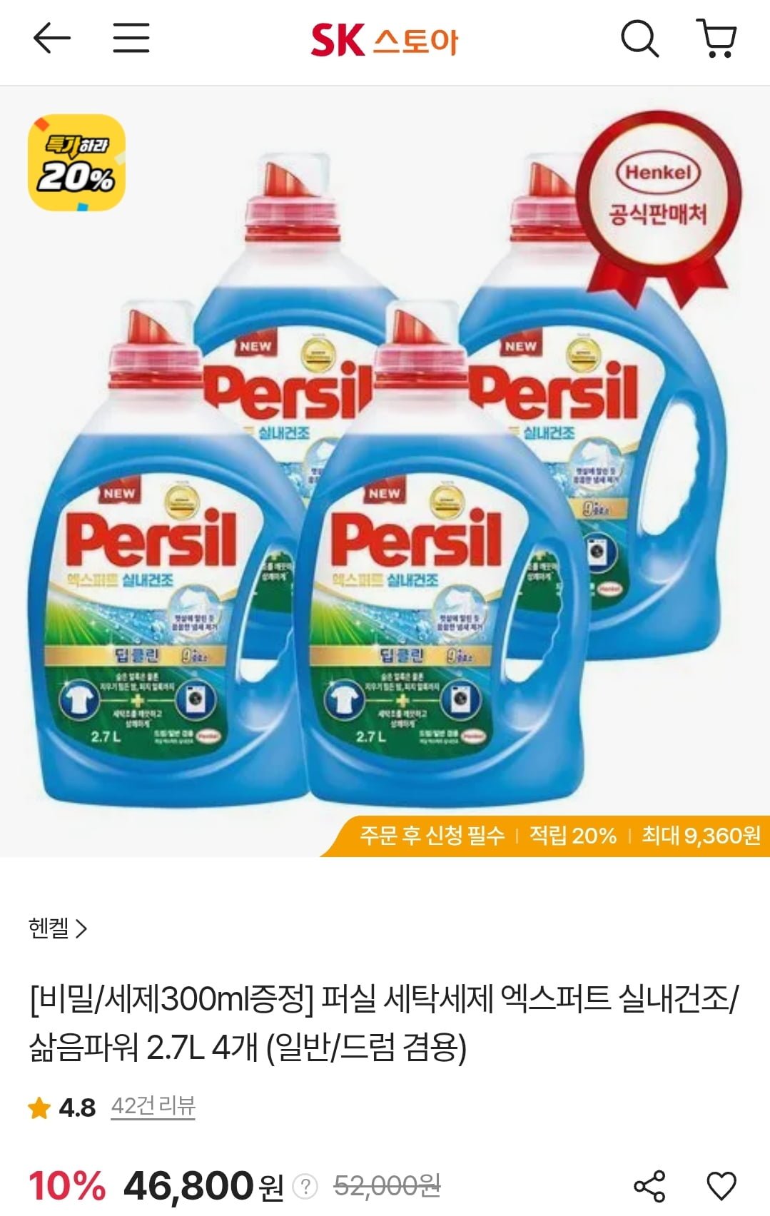 [SK스토아]퍼실 세탁세제 엑스퍼트 실내건조/삶음파워 2.7L 4개+세제300ml 증정 (46,800원/무료) - 딜모아