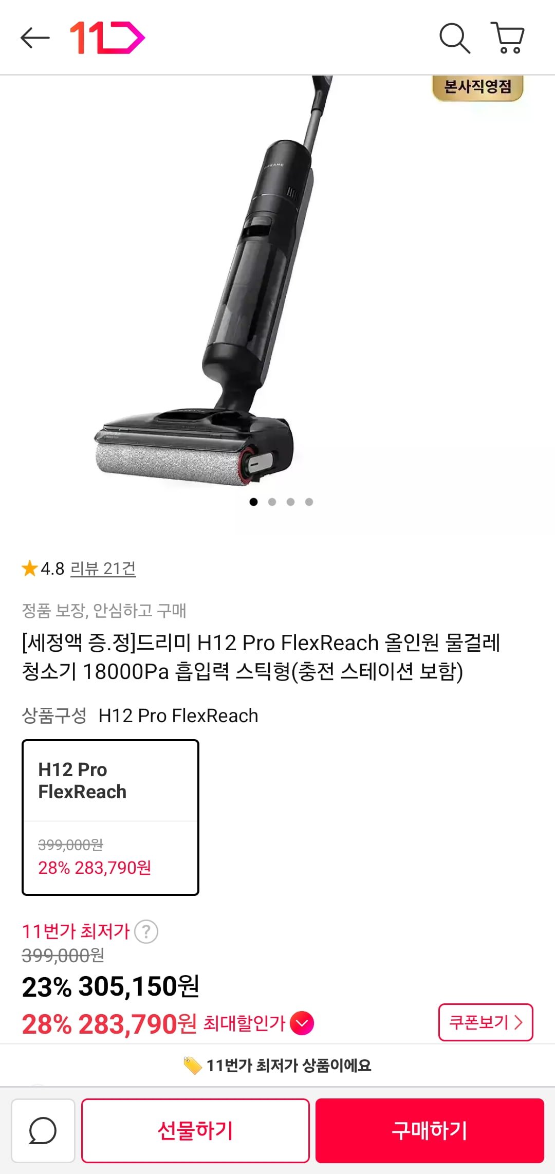 [11번가]드리미 물걸레청소기 H12 Pro FlexReach (283,790원/무료)