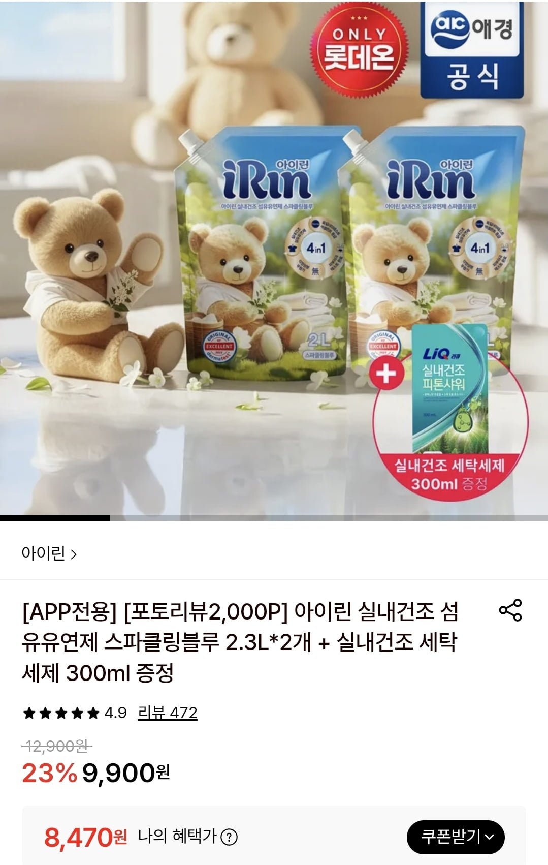 [롯데온]아이린 실내건조 섬유유연제 스파클링블루 2.3L*2개 + 실내건조 세탁세제 300ml 증정 (8,470원/무료) - 딜모아