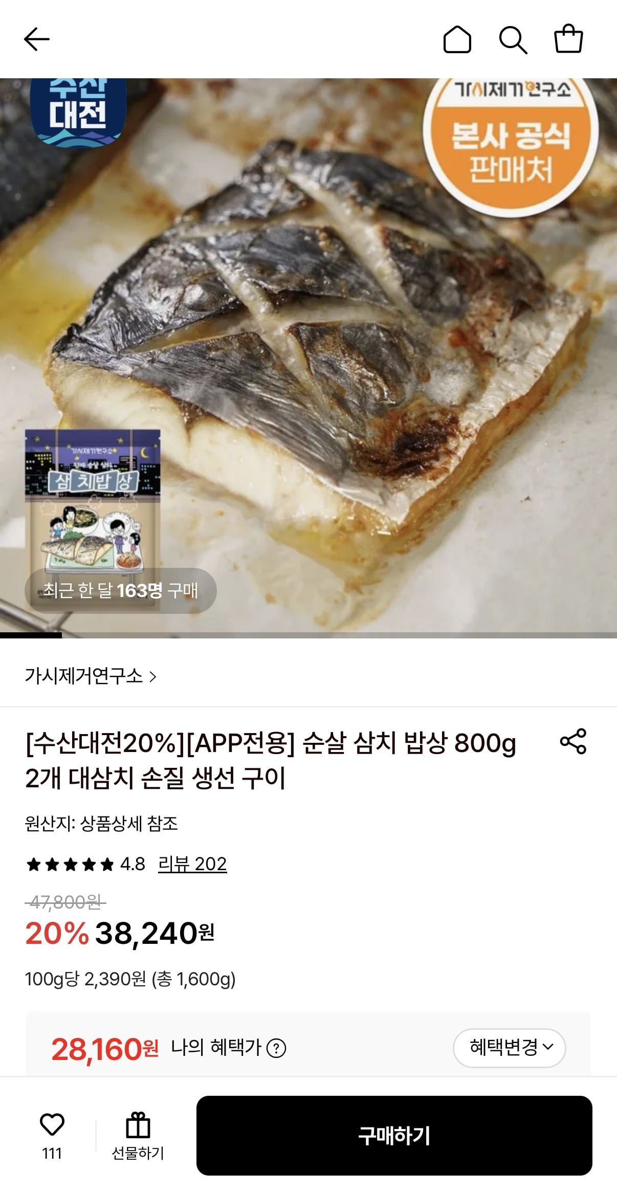 [롯데온]가시제거연구소 순살 삼치 밥상 800g 2개 (28,160원/무료)