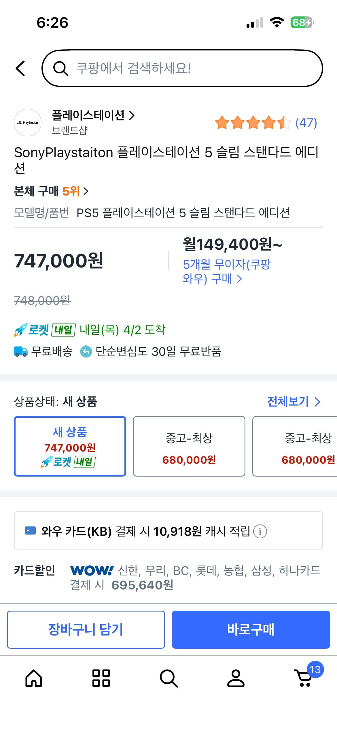 [쿠팡]SonyPlaystaiton 플레이스테이션 5 슬림 스탠다드 에디션(695,640/ 무료)