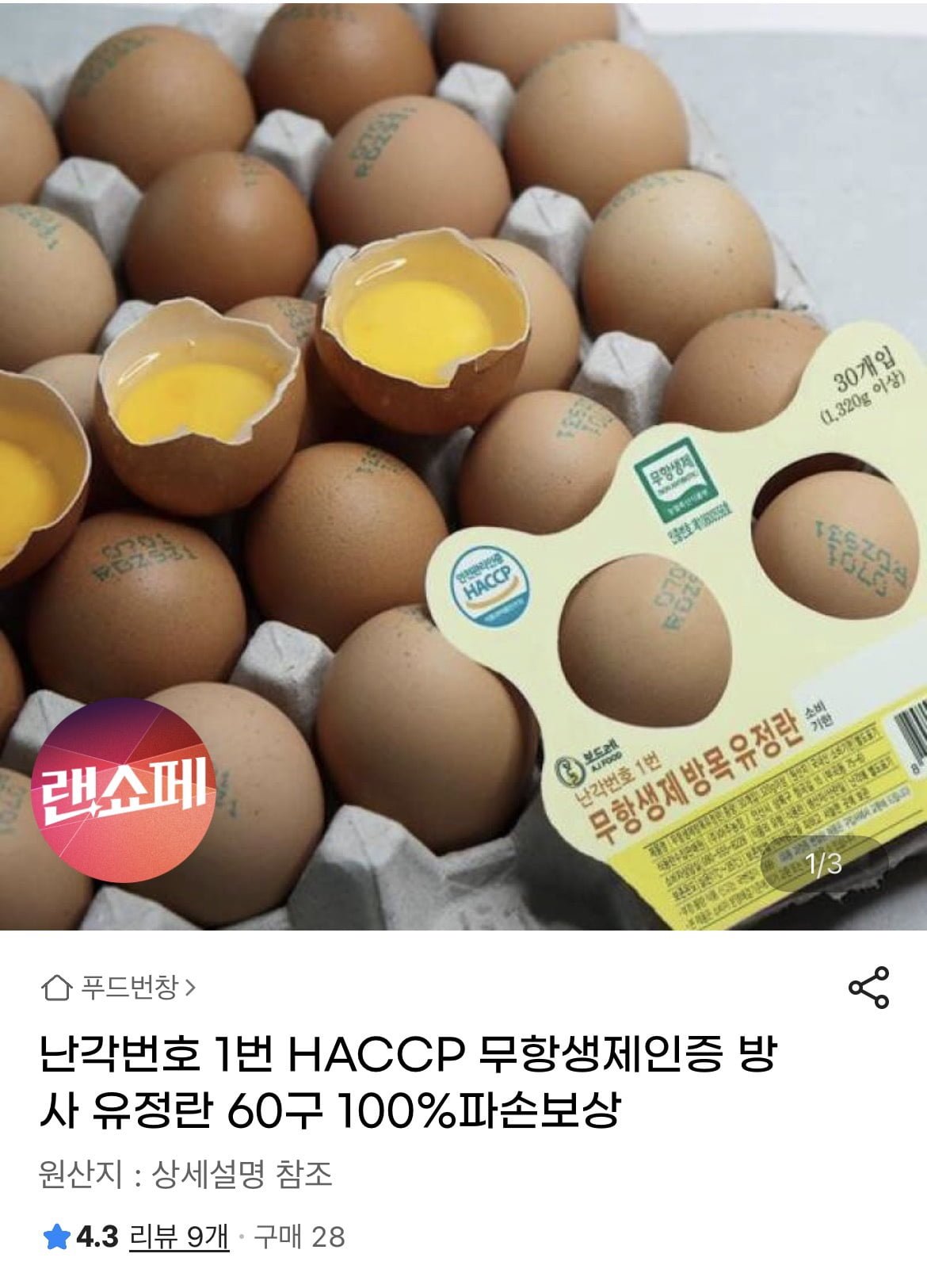 [지마켓]난각번호 1번 무항생제 인증 방사유정란 60구 (24,480원/무배)