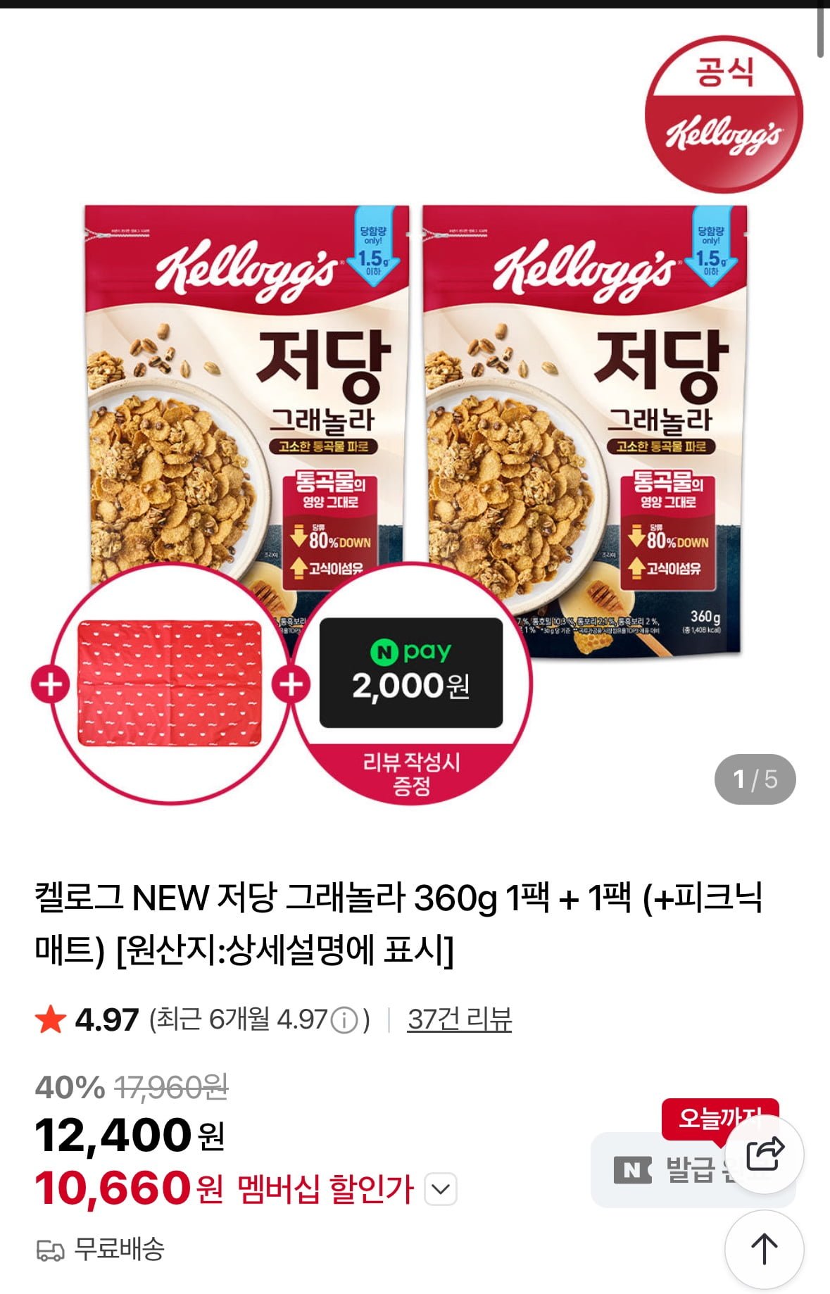 [네이버]켈로그 NEW 저당그래놀라 360g 2팩+매트증정(10,660원/무료)
