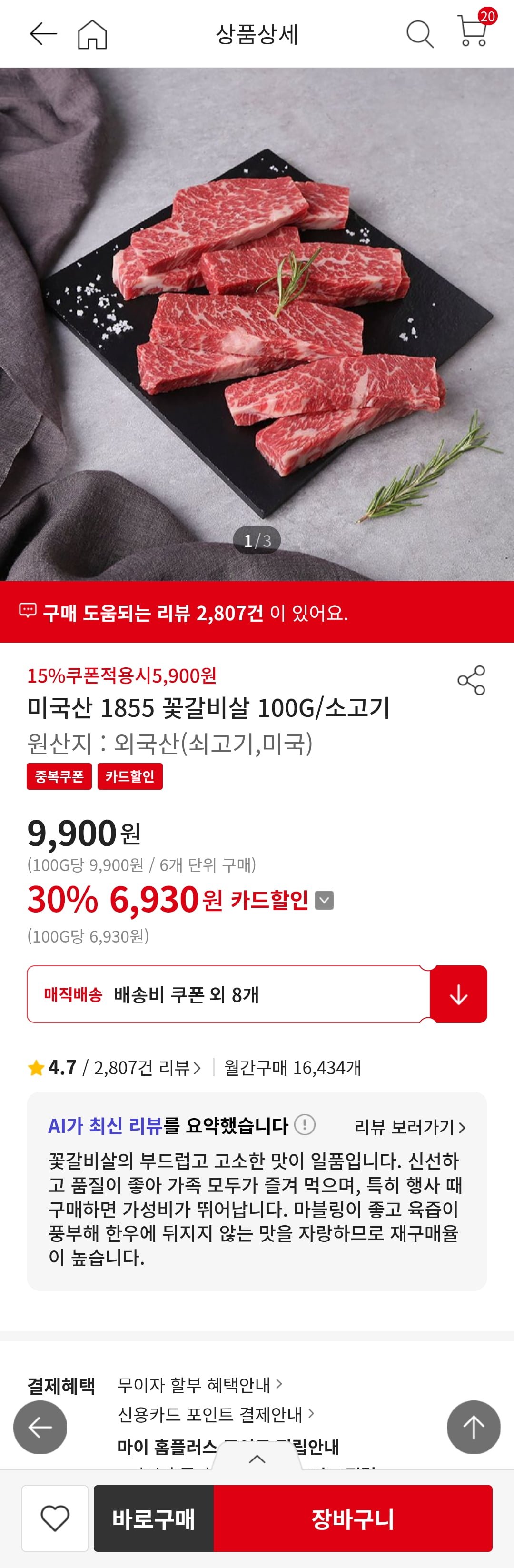 [홈플러스]미국산 꽃갈비살 100G/소고기 (5,900원/무료)