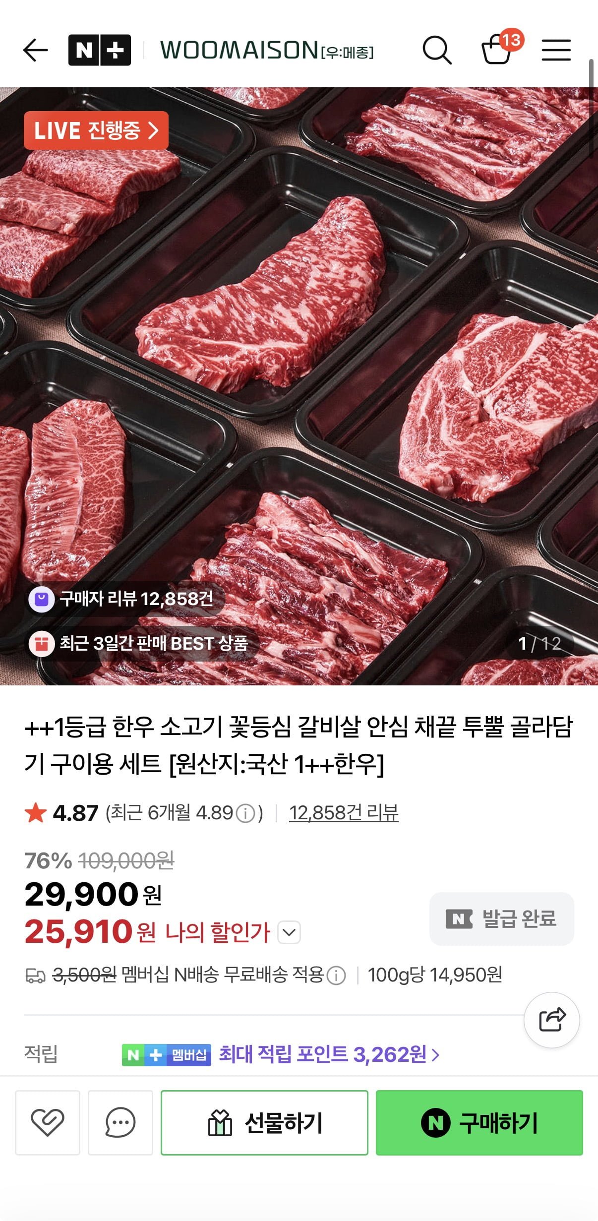 [네이버]++1등급 한우 소고기 꽃등심 200g (14320원/무배)