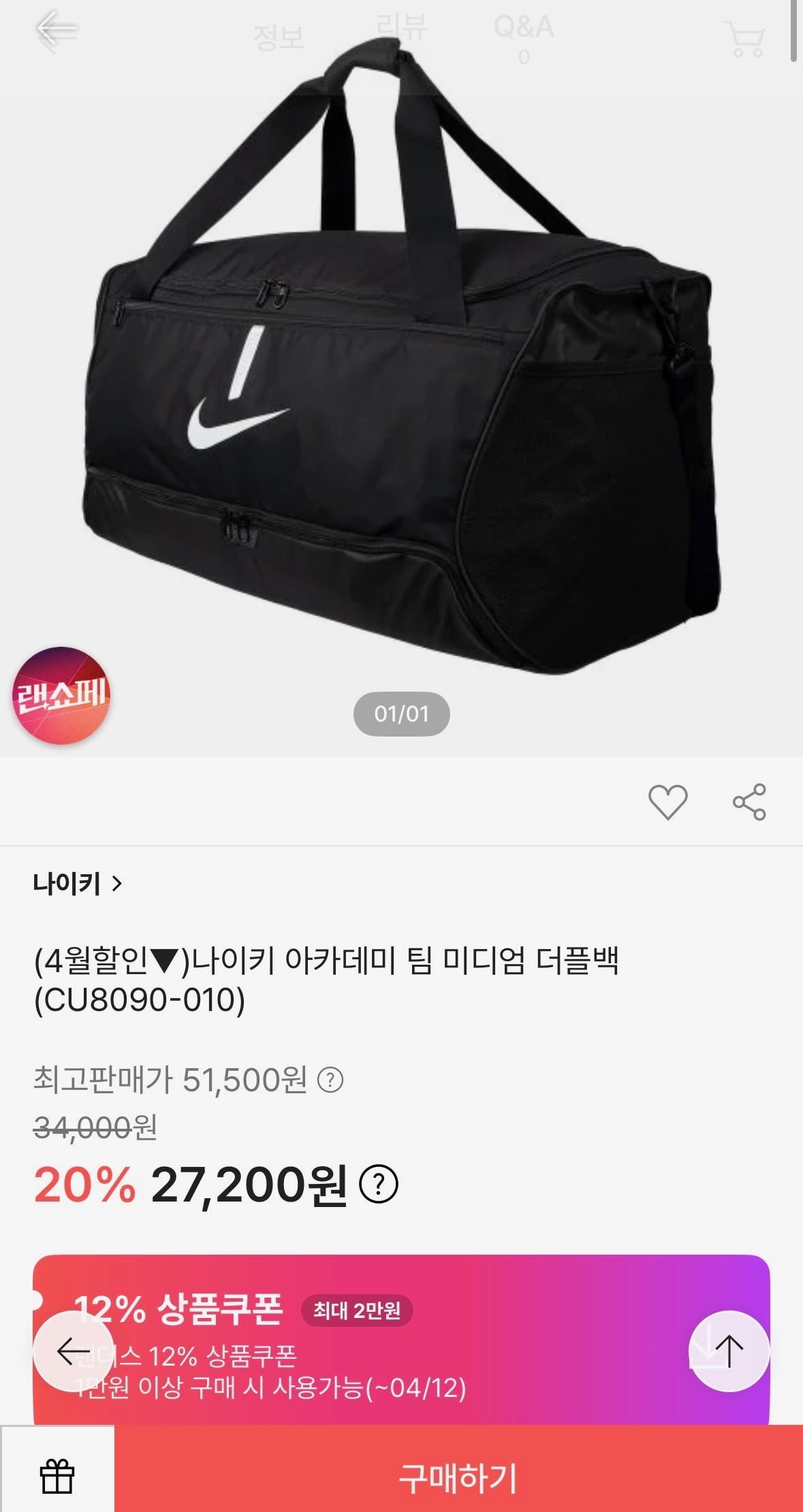 [ssg]나이키 아카데미팀 미디엄 더플백 60L (cu8090-010) (23,936원/3,000원)