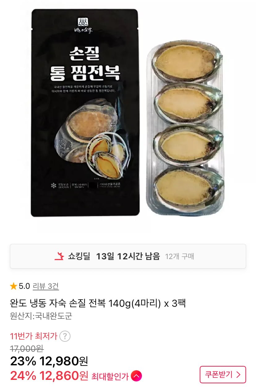 [11번가]완도 냉동 자숙 손질 전복 140g(4마리) x 3팩 (12,860원/무료)