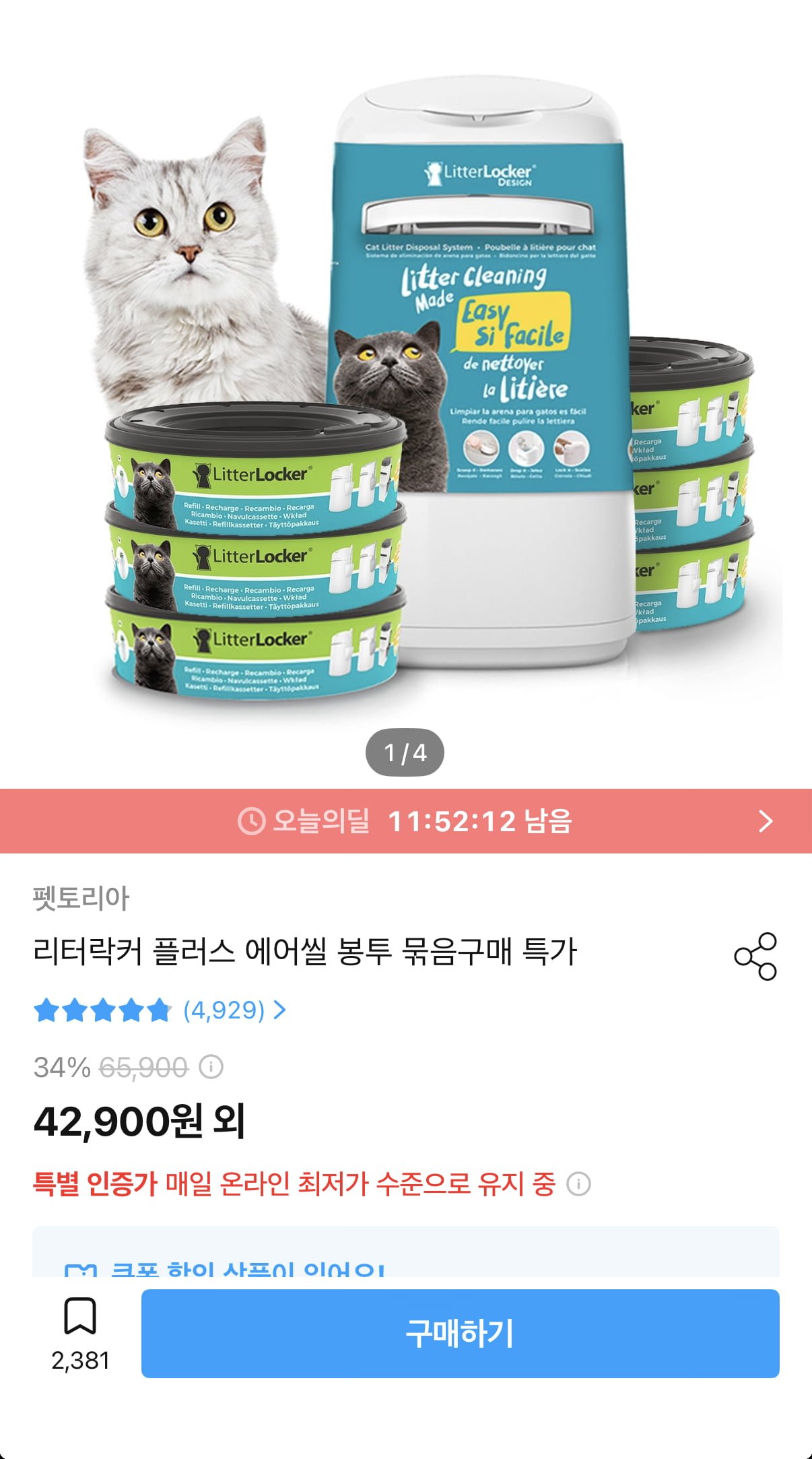[오늘의집]리터락커 플러스 고양이 모래 배변 휴지통 본품 (28,110원/무료)