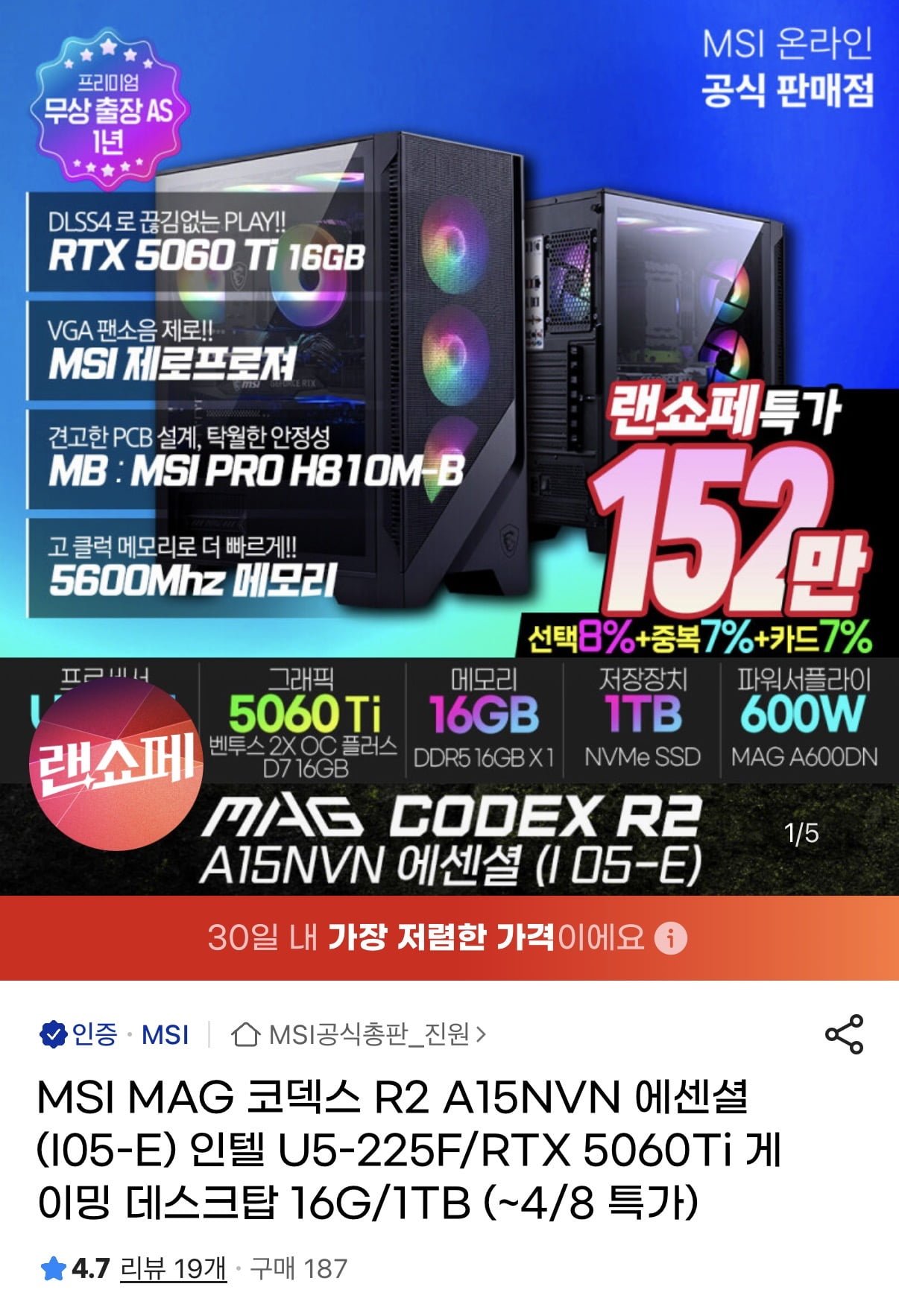 [G마켓]MSI MAG 코덱스 R2 A15NVN 에센셜 (I05-E) 인텔 U5-225F/RTX 5060Ti 게이밍 데스크탑 (1,529,740원 / 무배)뽐뿌·11일 전·1,529,740원👍 0💬 6전자ITG마켓원문 보기 →