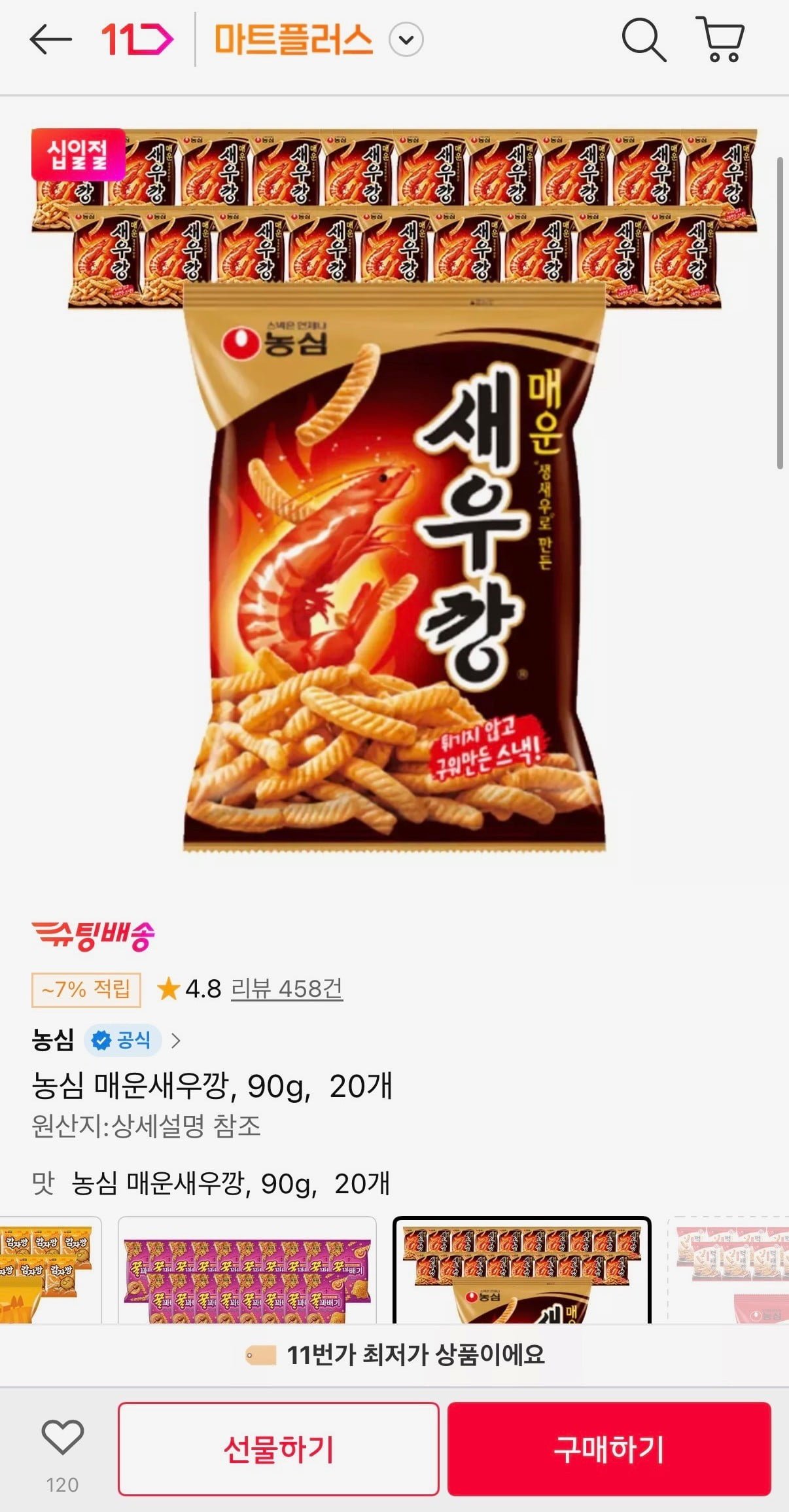 [11번가]농심 매운새우깡 90g 20개 (티멤 16,860원/무료)
