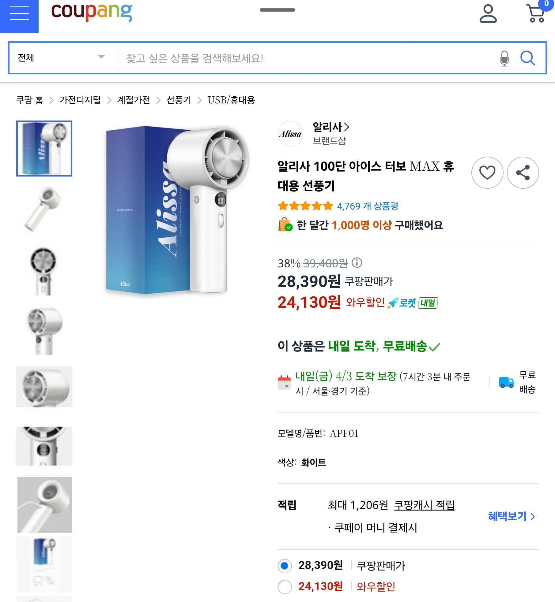 [쿠팡]알리사 100단 휴대용 냉각 손선풍기 (24,130원/무배) - 딜모아