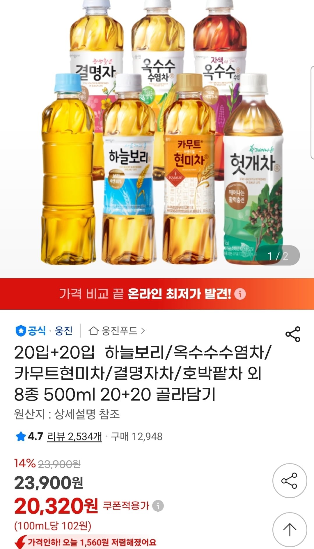[지마켓]하늘보리,헛개차 등 20+20개 골라담기 (20,230원/무료)