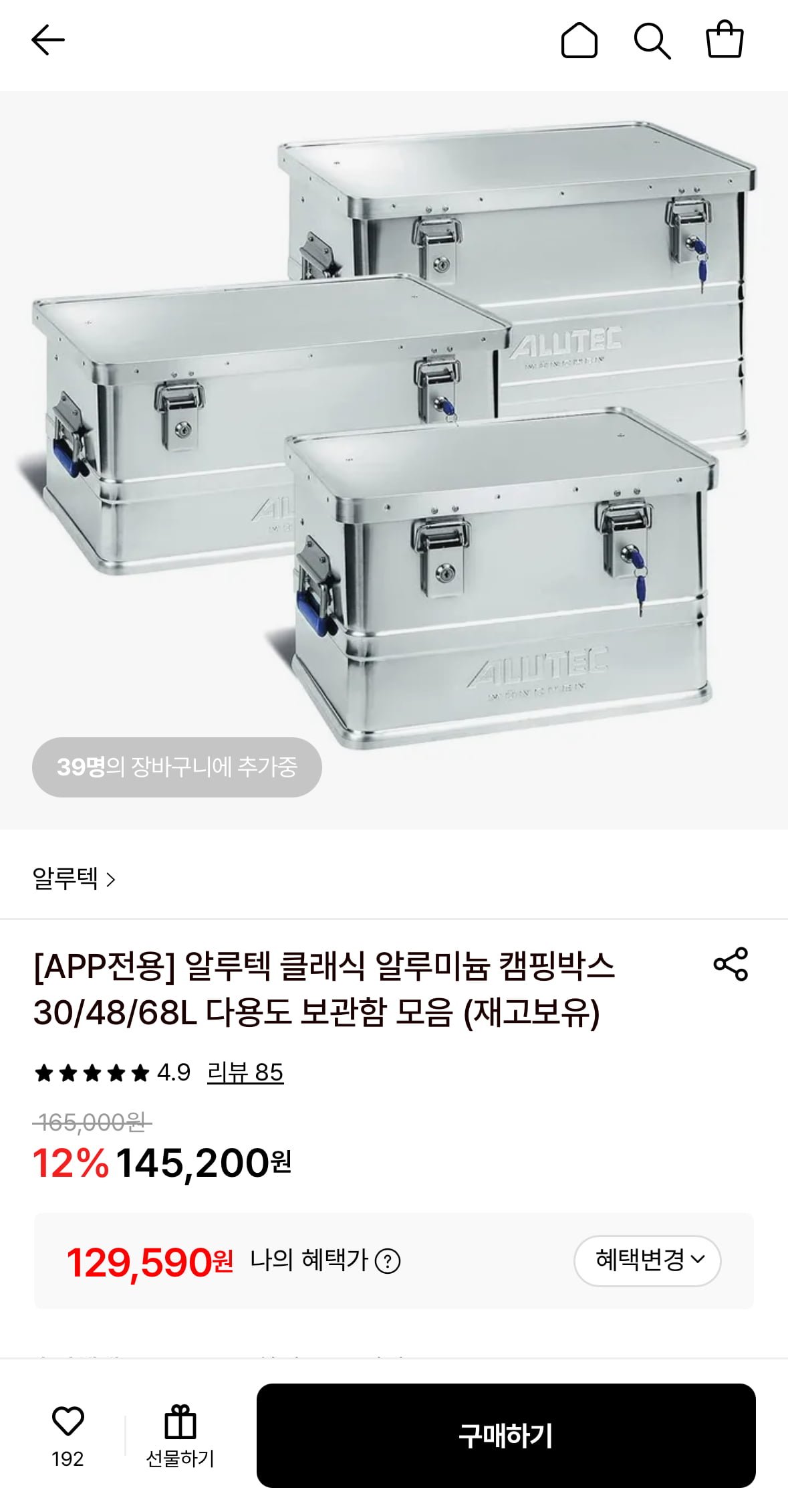 [롯데온]알루텍 클래식 알루미늄 캠핑박스 30/48/68L (129,590원~/무료)
