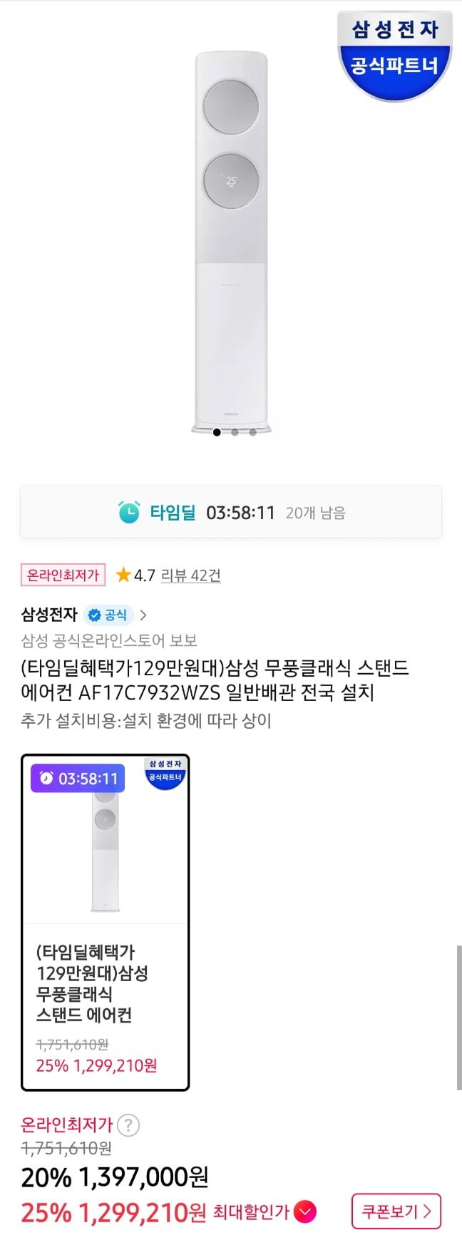 [11번가]삼성 무풍 클래식 스탠드 에어컨 AF17C7932WZS (1,299,210원/무료) - 딜모아