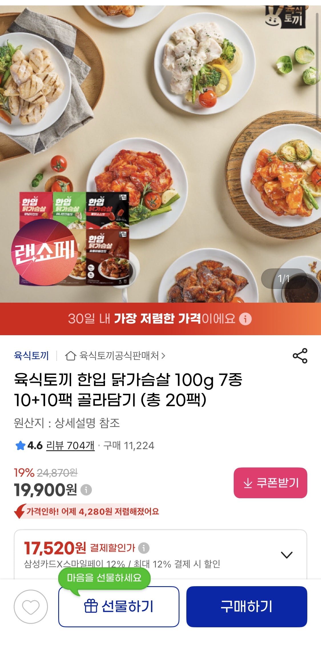 [지마켓]육식토끼 한입 닭가슴살 100g 7종 20팩 (19,990원/무료배송)