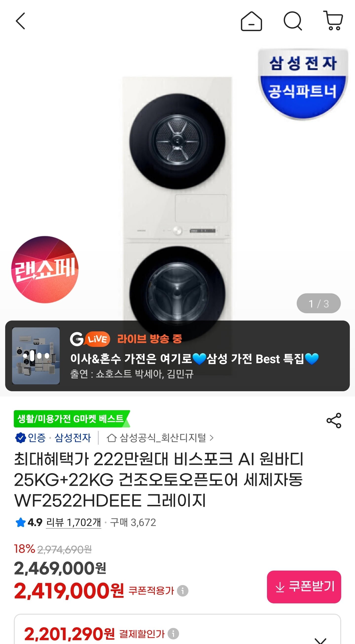 [지마켓]삼성 비스포크 AI 원바디 세탁25kg+건조22kg 오토오픈도어 WF2522HDEEE 그레이지 (2,246,790원/무료)뽐뿌·11일 전·2,246,790원👍 0💬 6뷰티패션지마켓원문 보기 →