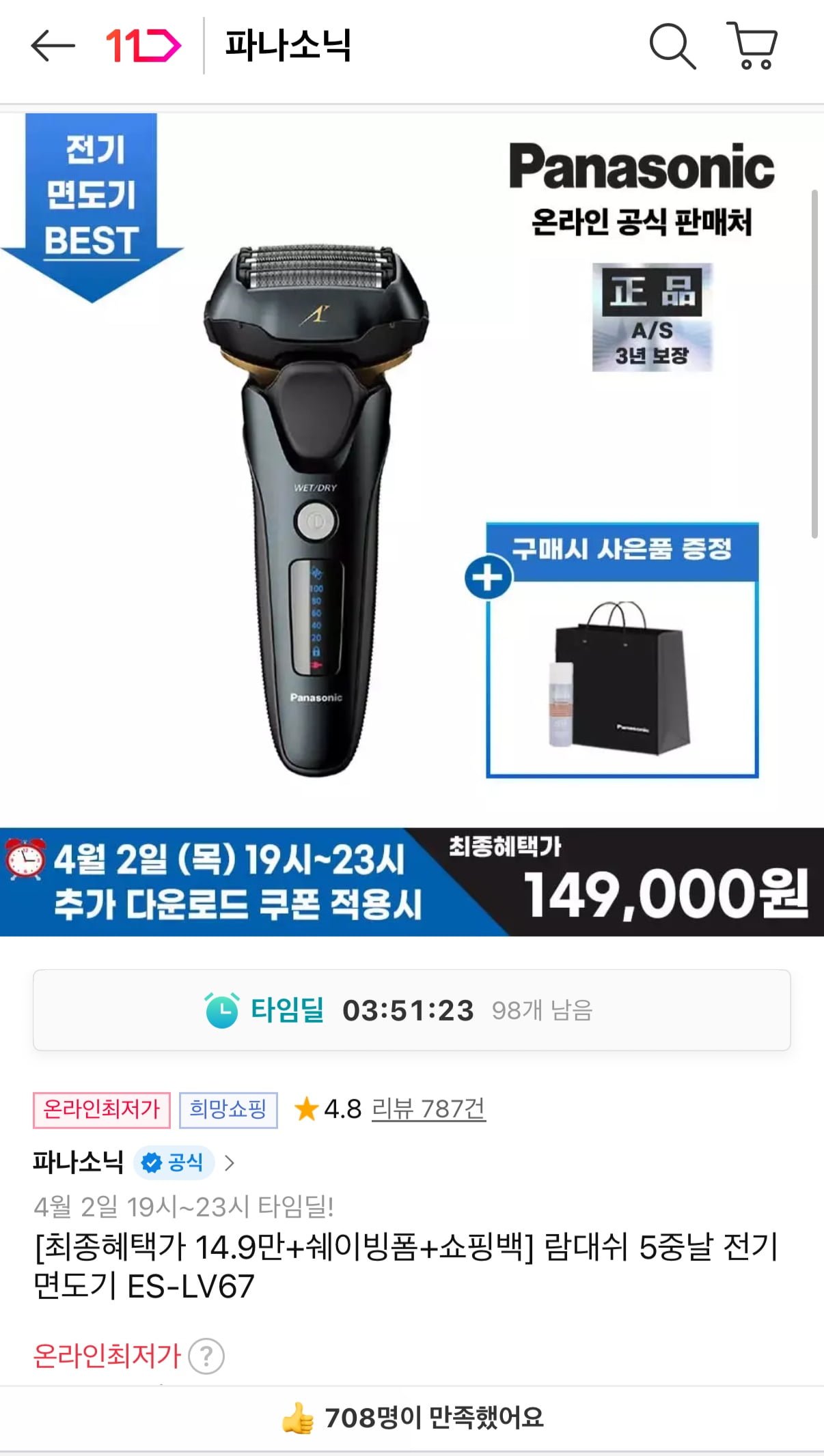 [11번가]람대쉬 5중날 전기 면도기 ES-LV67 (149,000원/무료)
