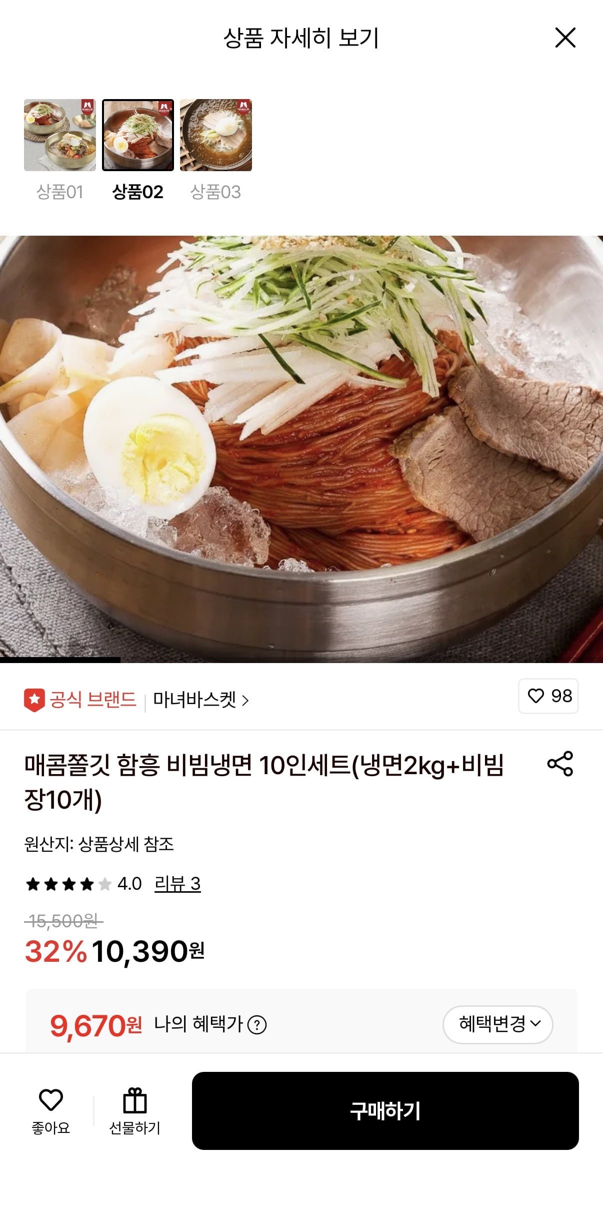 [롯데온]함흥 비빔냉면 10인세트 (냉면 2kg+비빔장 10개) (9,670원/무료)