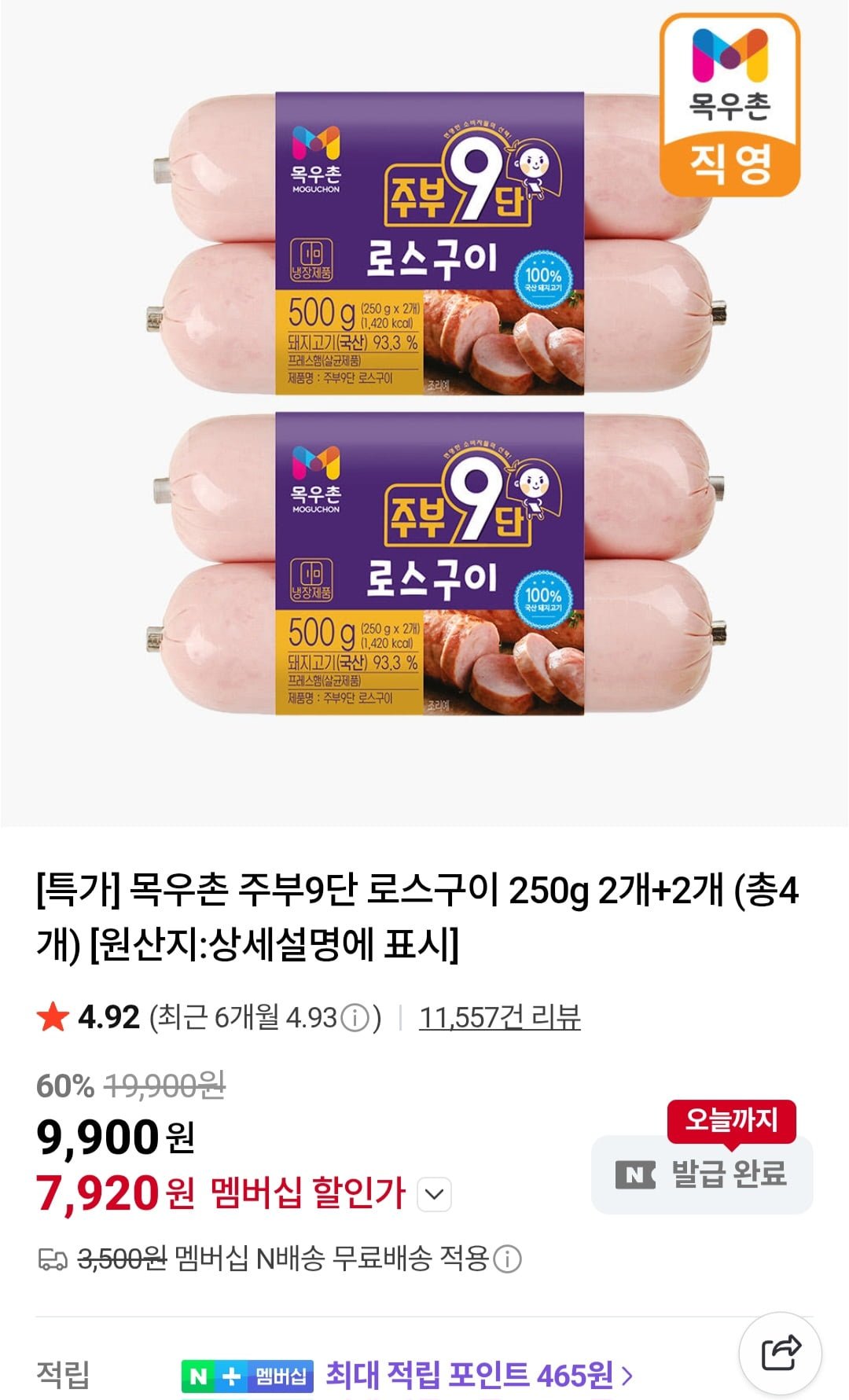 [네이버]멤버십 주부9단 목우촌 로스구이햄 1kg (7,920원/무료)