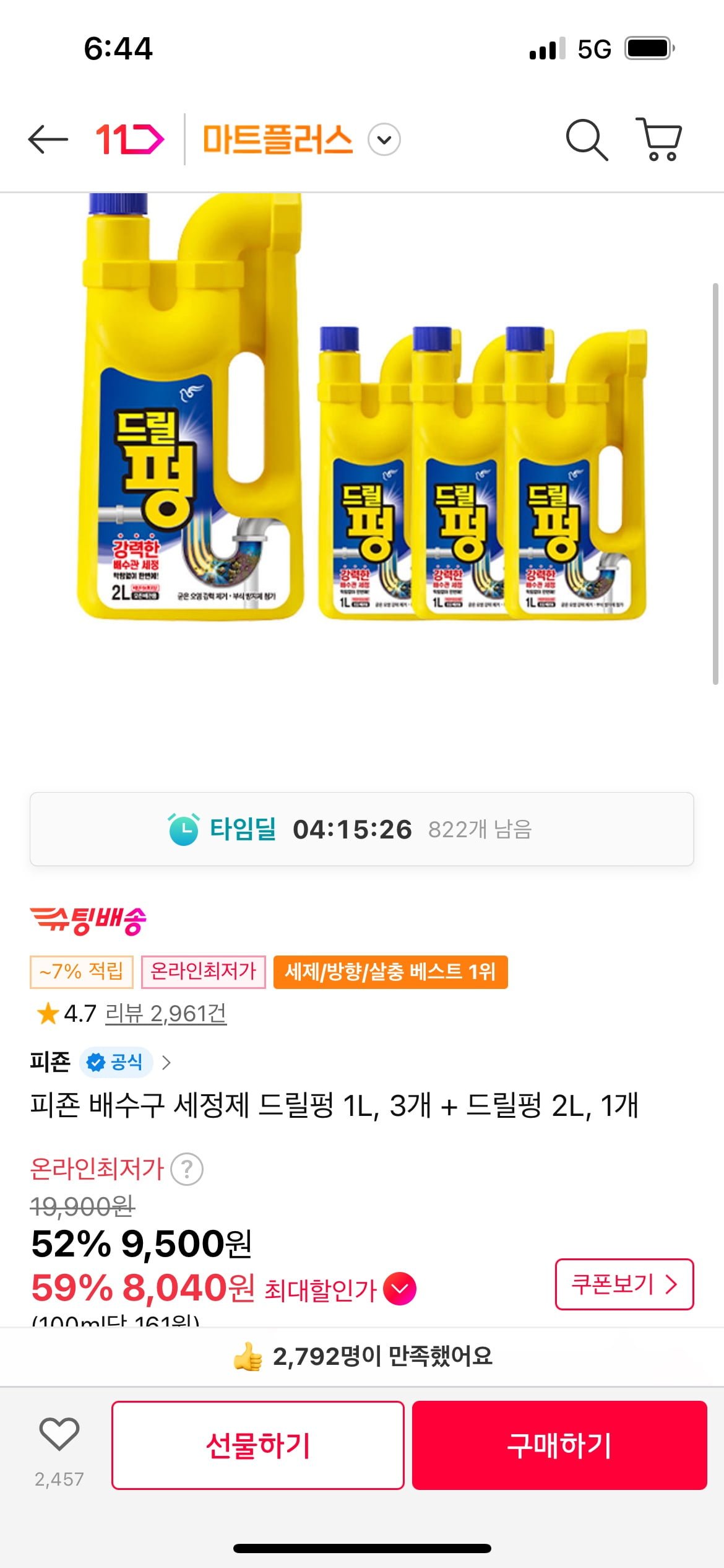 [11번가]피죤 배수구 세정제 드릴펑 1L, 3개 + 드릴펑 2L, 1개 (9,500원/무료)