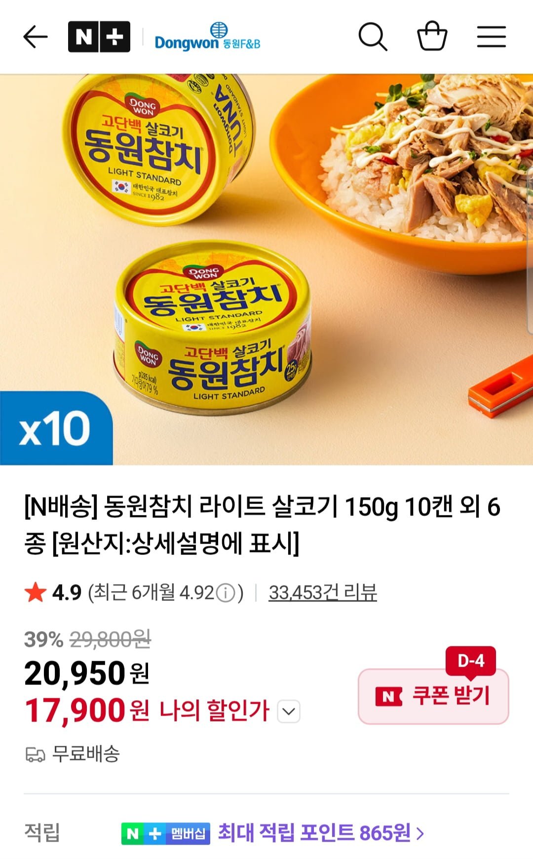 [네이버]동원참치 라이트 살코기 150g 10캔 (17,900원/무료)