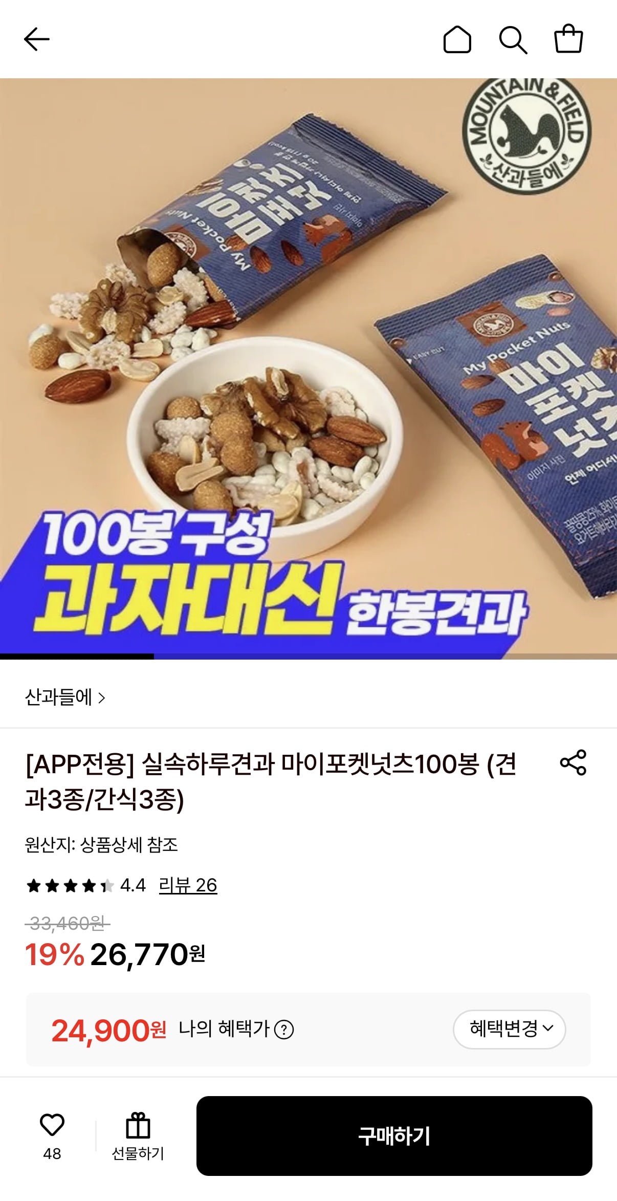 [롯데온]산과들에 실속하루견과 마이포켓넛츠100봉 (24,900원/무료)
