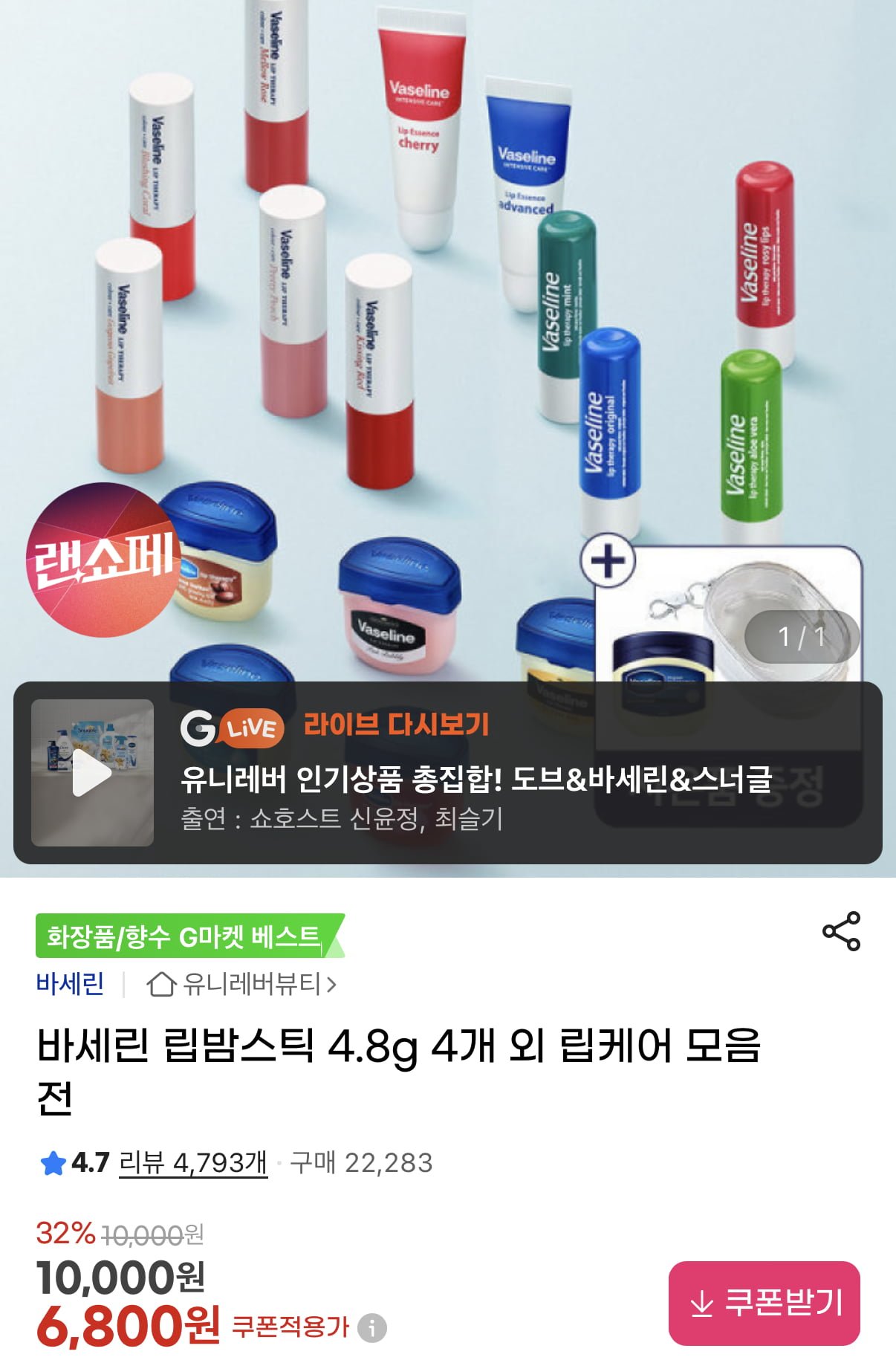[지미켓]바세린 립밤스틱 4.8g 4개외 립케어 모음전 (6,800원/무료)