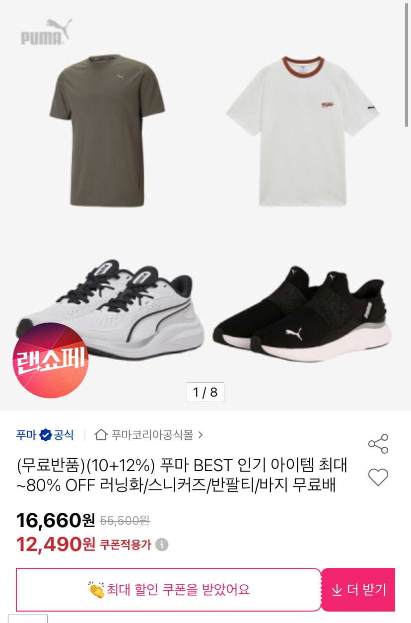 [옥션]푸마 러닝화/스니커즈/반팔티/바지 등 (10,320원~/무배)