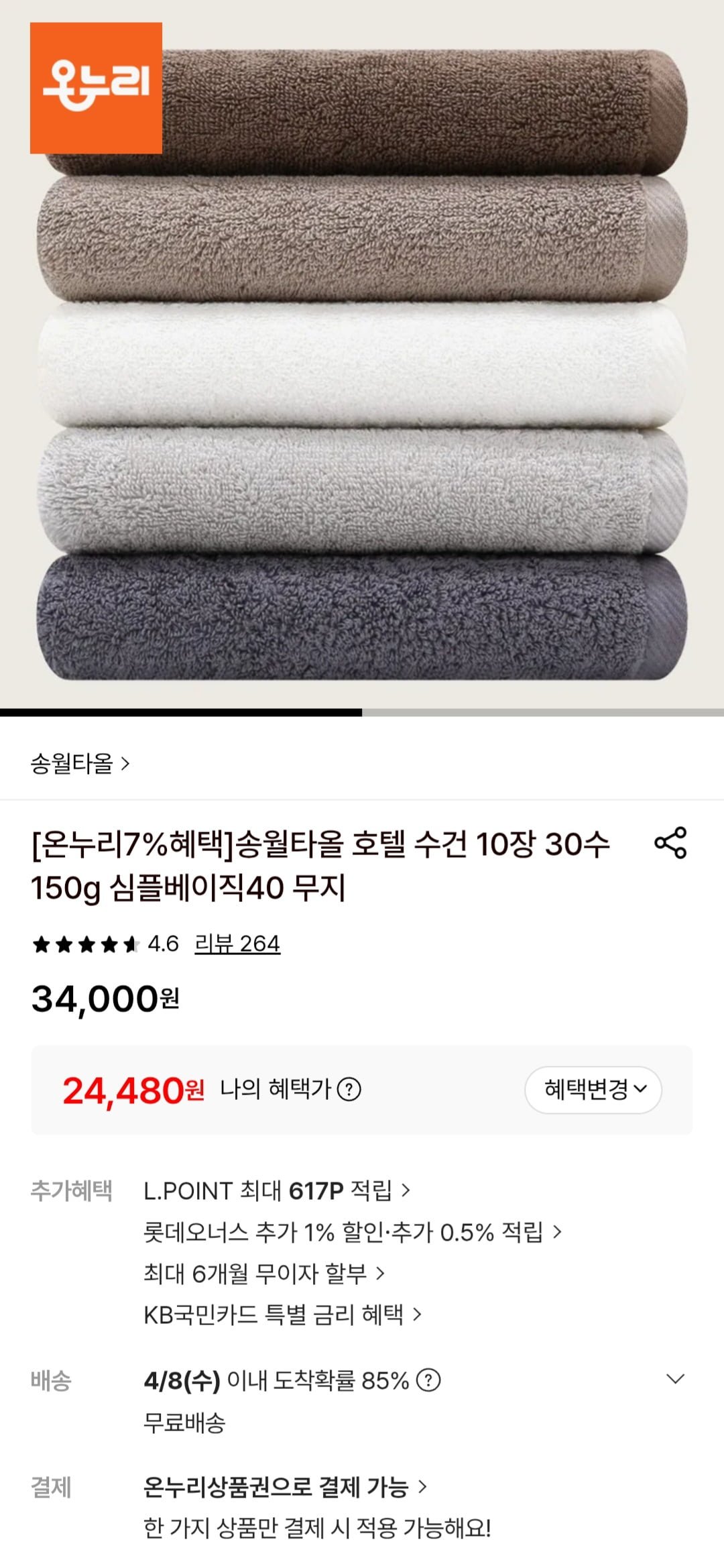[롯데온]송월타올 호텔 수건 10장 30수 150G (24,480원/무료)