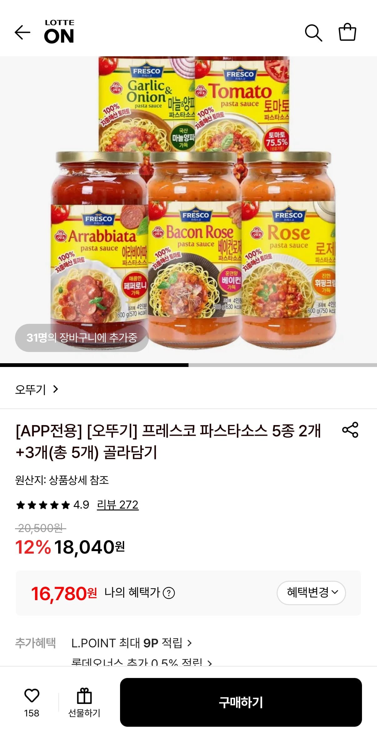 [롯데온]오뚜기 프레스코 파스타소스 5종 2개+3개 총 5개 골라담기(16,780원/무료)