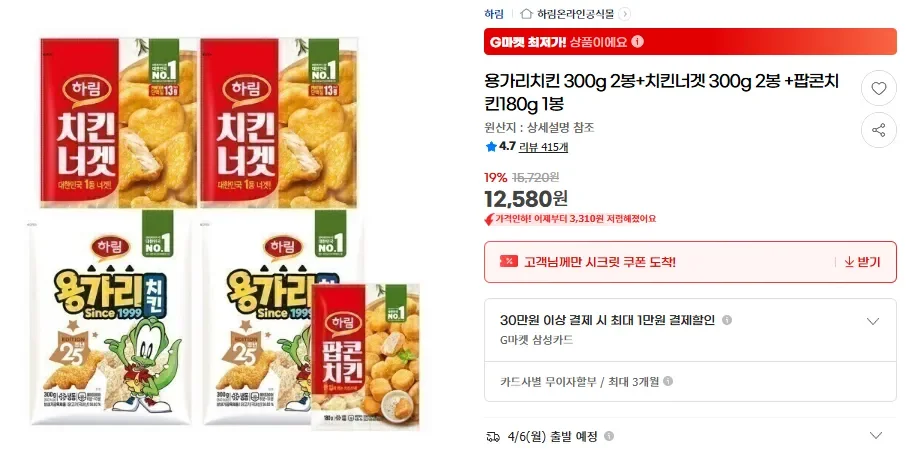 [지마켓]용가리치킨 300g 2봉+치킨너겟 300g 2봉 +팝콘치킨180g 1봉 (12,580원/무료)
