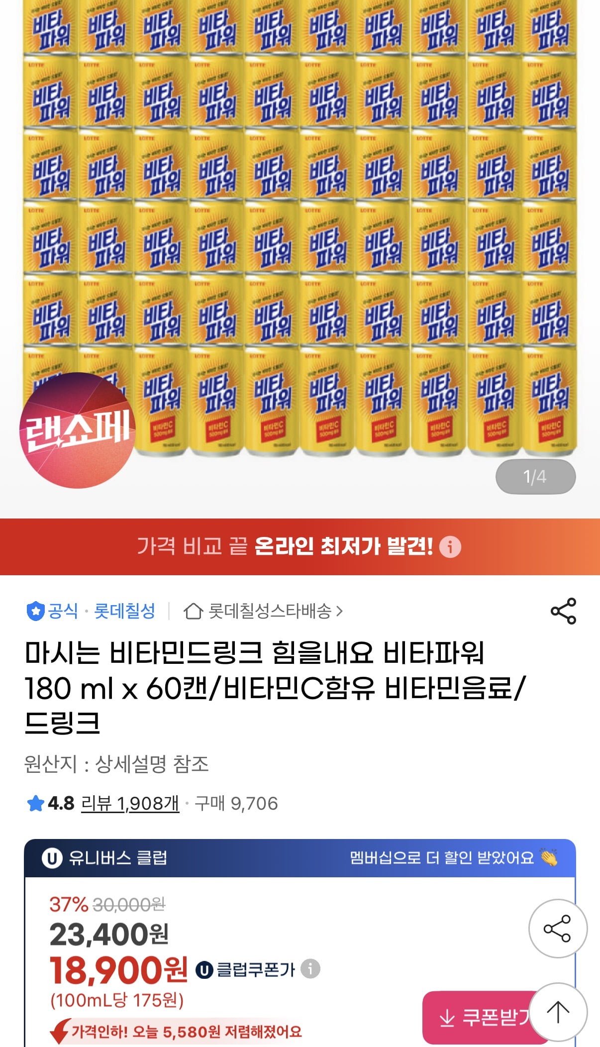 [지마켓]롯데 비타파워 180ml 60캔(유클18,900원/무배) - 딜모아