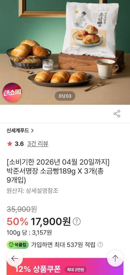 [ssg]신세계푸드 박준서명장 소금빵 189g x 3개 (총9개) 기한26.04.20 (15,752원/무료)