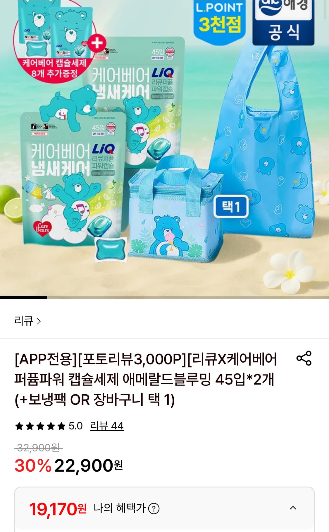 [롯데온]리큐X케어베어 퍼퓸파워 캡슐세제 애메랄드블루밍 45입 2개 (19,170원/무료)