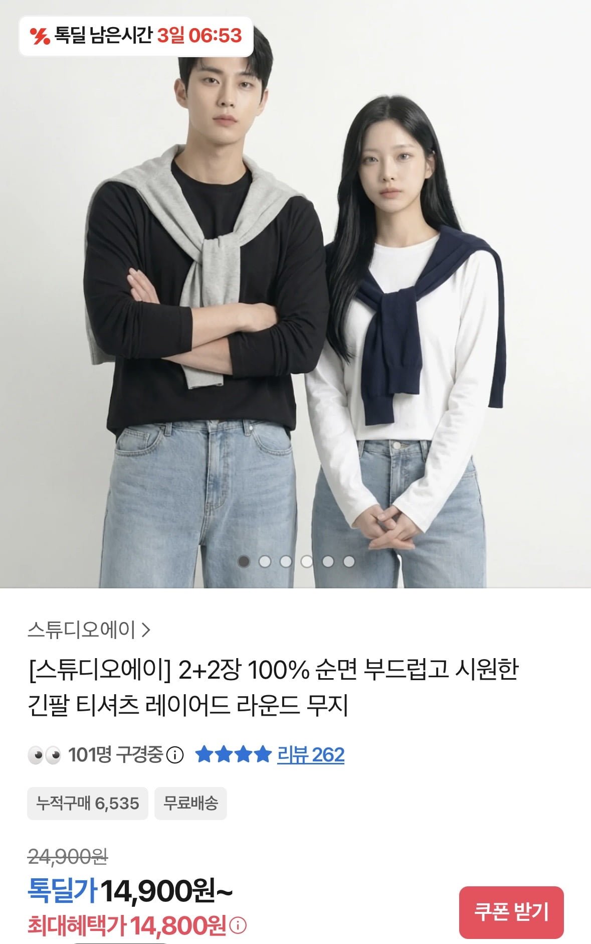 [톡딜]2+2장 100% 순면 부드럽고 시원한 긴팔 티셔츠 (14,900원/무배)