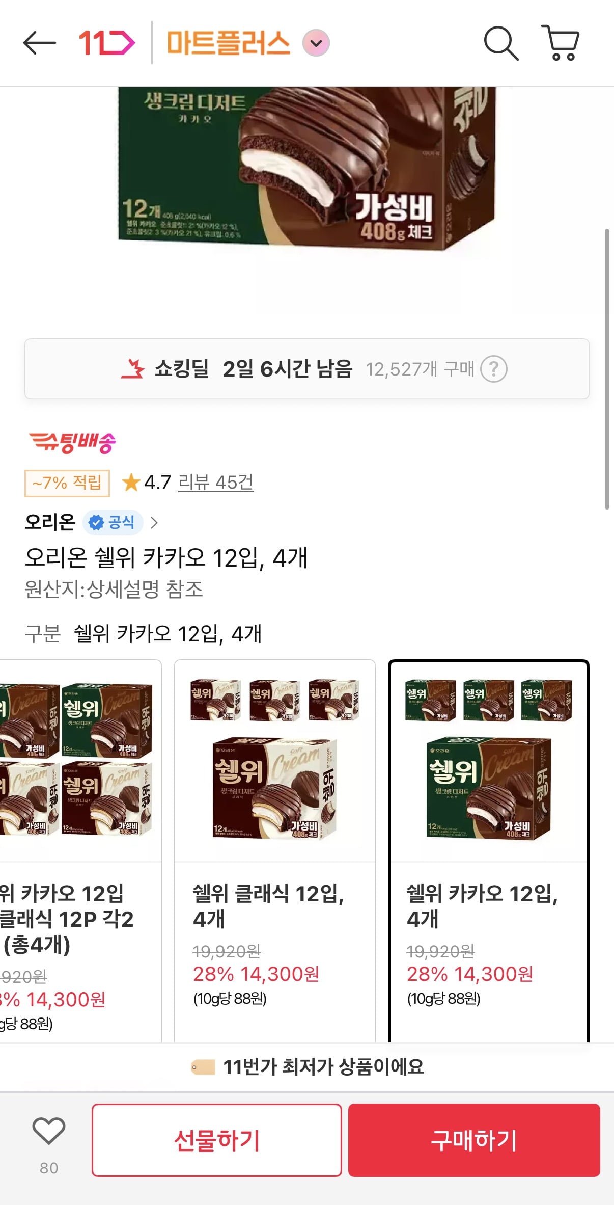[11번가]오리온 쉘위 카카오 12입 4개 (티멤14,300원/무료)
