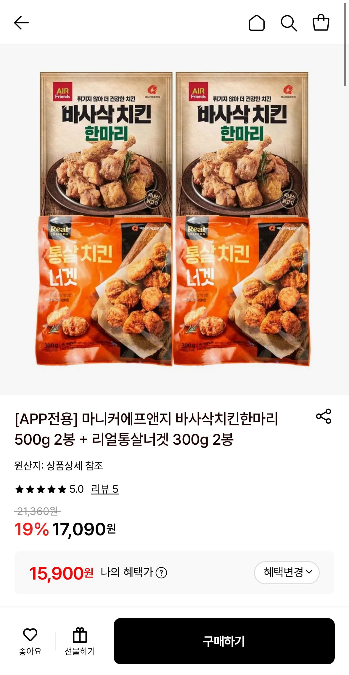 [롯데온]마니커에프앤지 바사삭한마리 치킨 500G 2개+통살치킨너겟 2봉 (15,900원/무료) - 딜모아