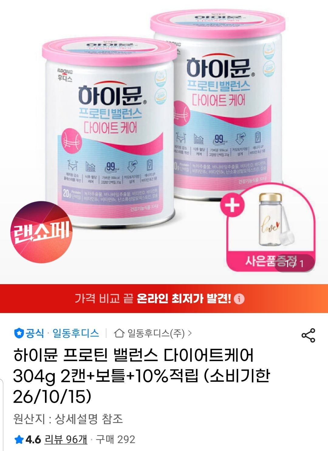 [지마켓]하이뮨 프로틴 밸런스 다이어트케어 304g 2캔+보틀 (25,080원/무료)