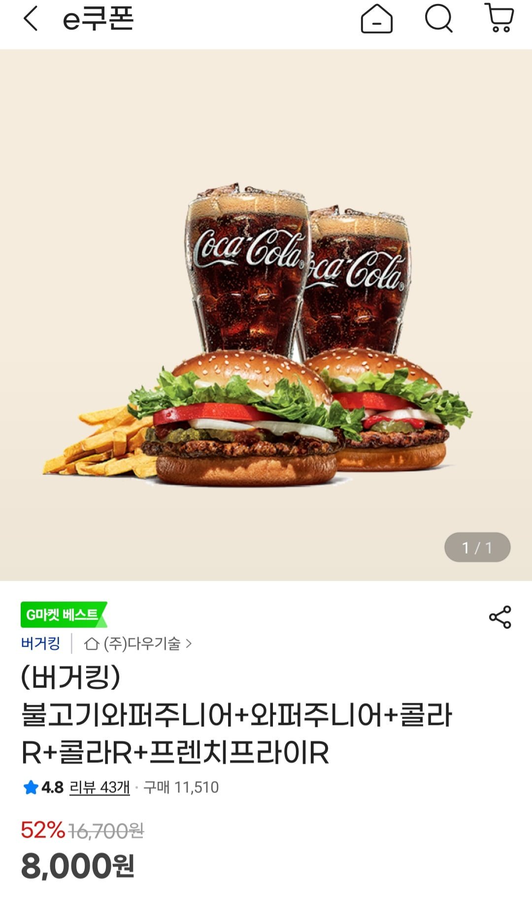 [지마켓](버거킹) 불고기와퍼주니어+와퍼주니어+콜라R+콜라R+프렌치프라이R (8,000원/무료)