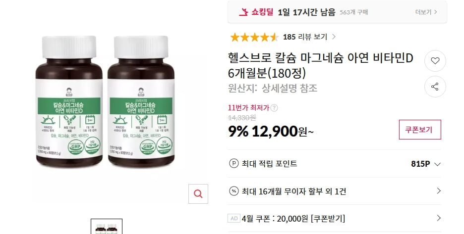 [11번가]칼슘 마그네슘 아연 비타민D 180정 (12,900/무료) - 딜모아