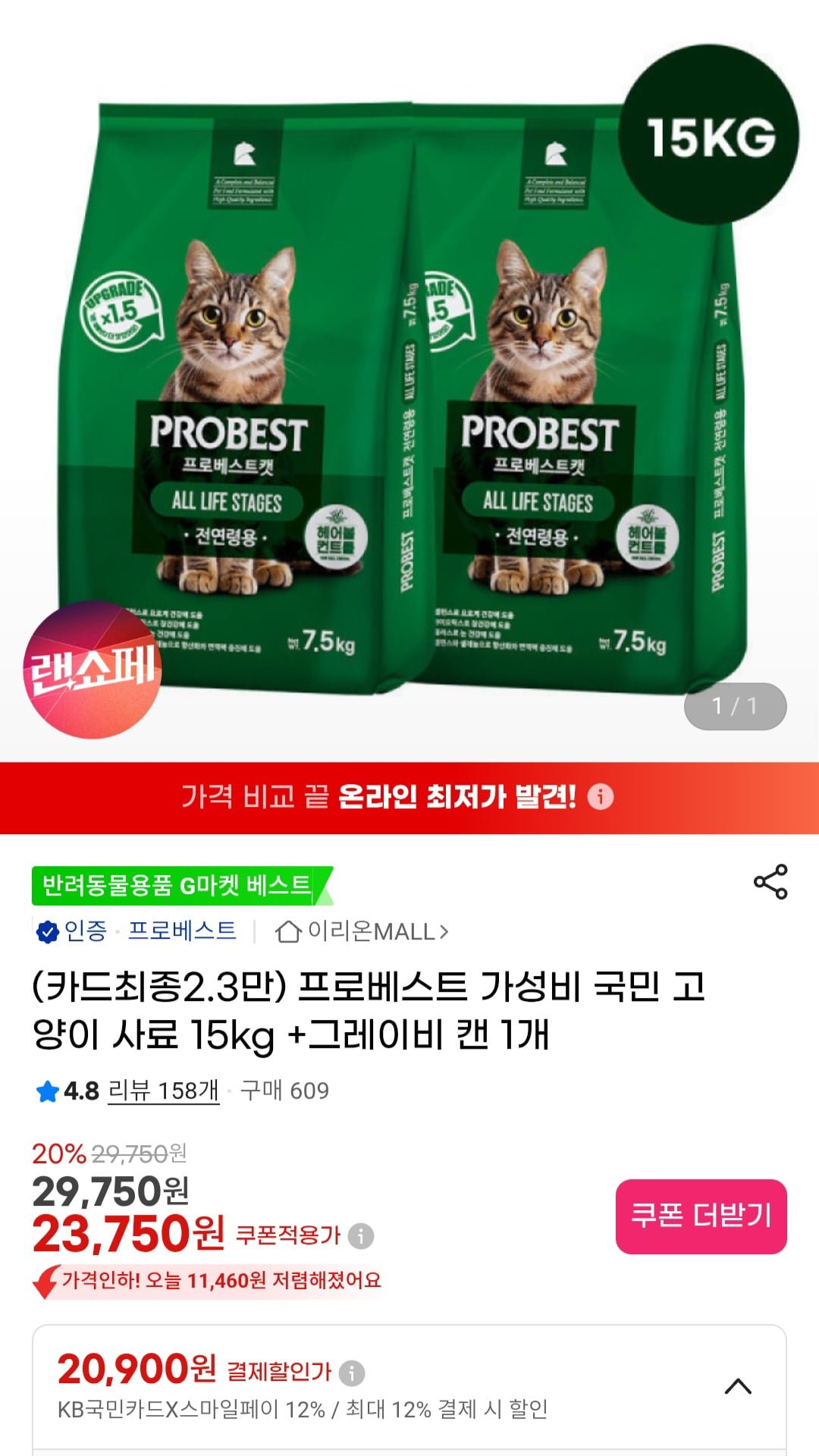 [지마켓]프로베스트 고양이 사료 15kg+그레이비캔 1통 (카드 20,900원/무료)